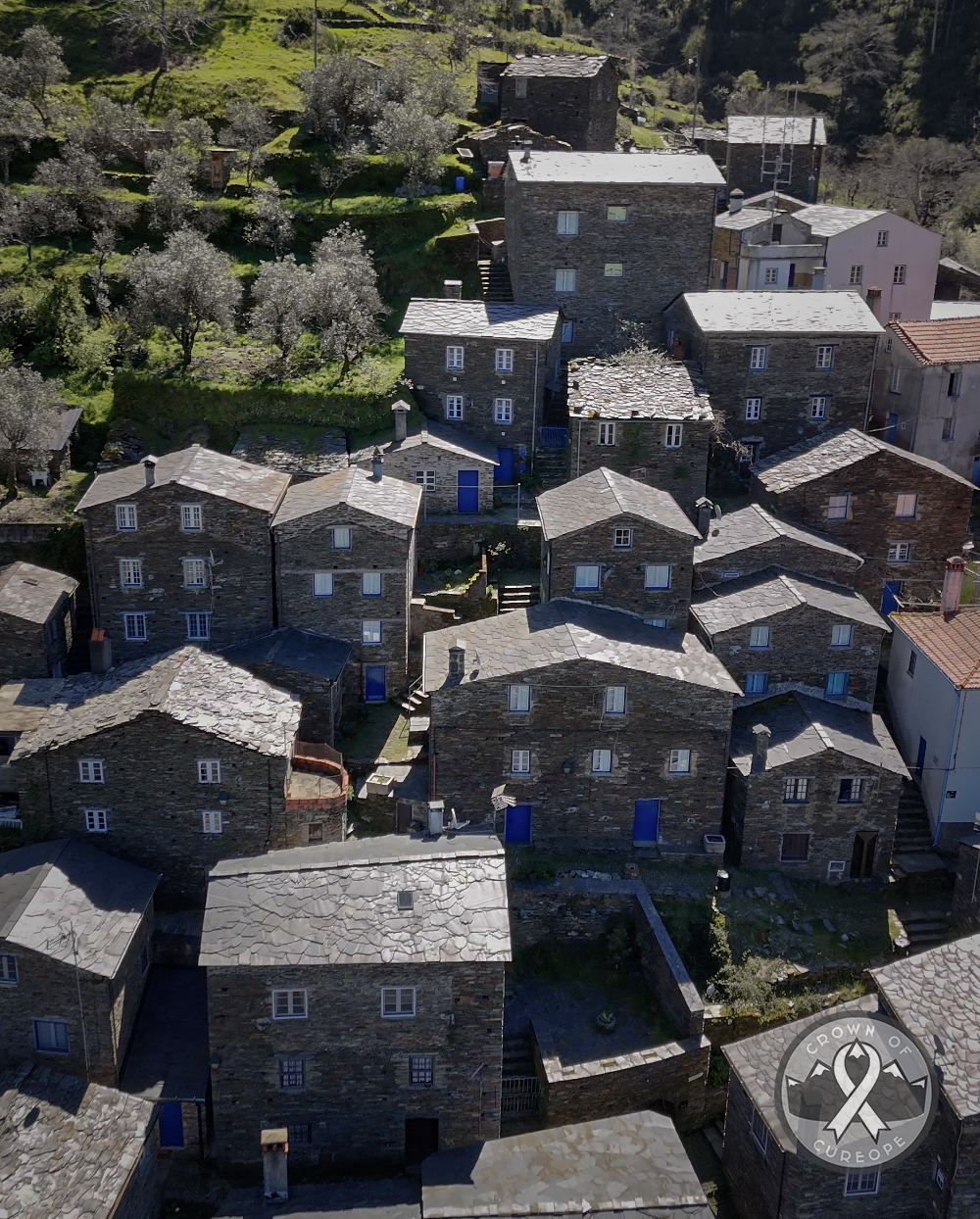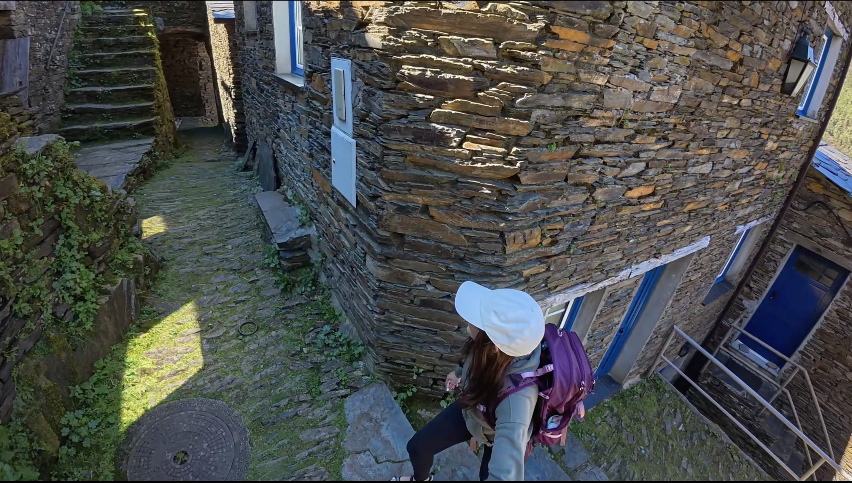 Then, it was time to drive onward to Piódão, less than 30 minutes away. Piódão is one of Portugal’s 12 Historical Villages, and it’s the only one without a castle. That said, it has its own centerpiece: a bright white church, the Igreja Matriz de Piódão. This really stood out against the mostly gray/brown, uniform look of the rest of the village. The gray/brown comes from schist rock that’s widely available in the region, so it was used for both the houses themselves and the walkways. Both the church and the village houses have blue accents, apparently because it was the only paint color available in the village. It’s pretty remote, even more so before it was connected to the main road in 1974, so it was difficult to bring supplies.