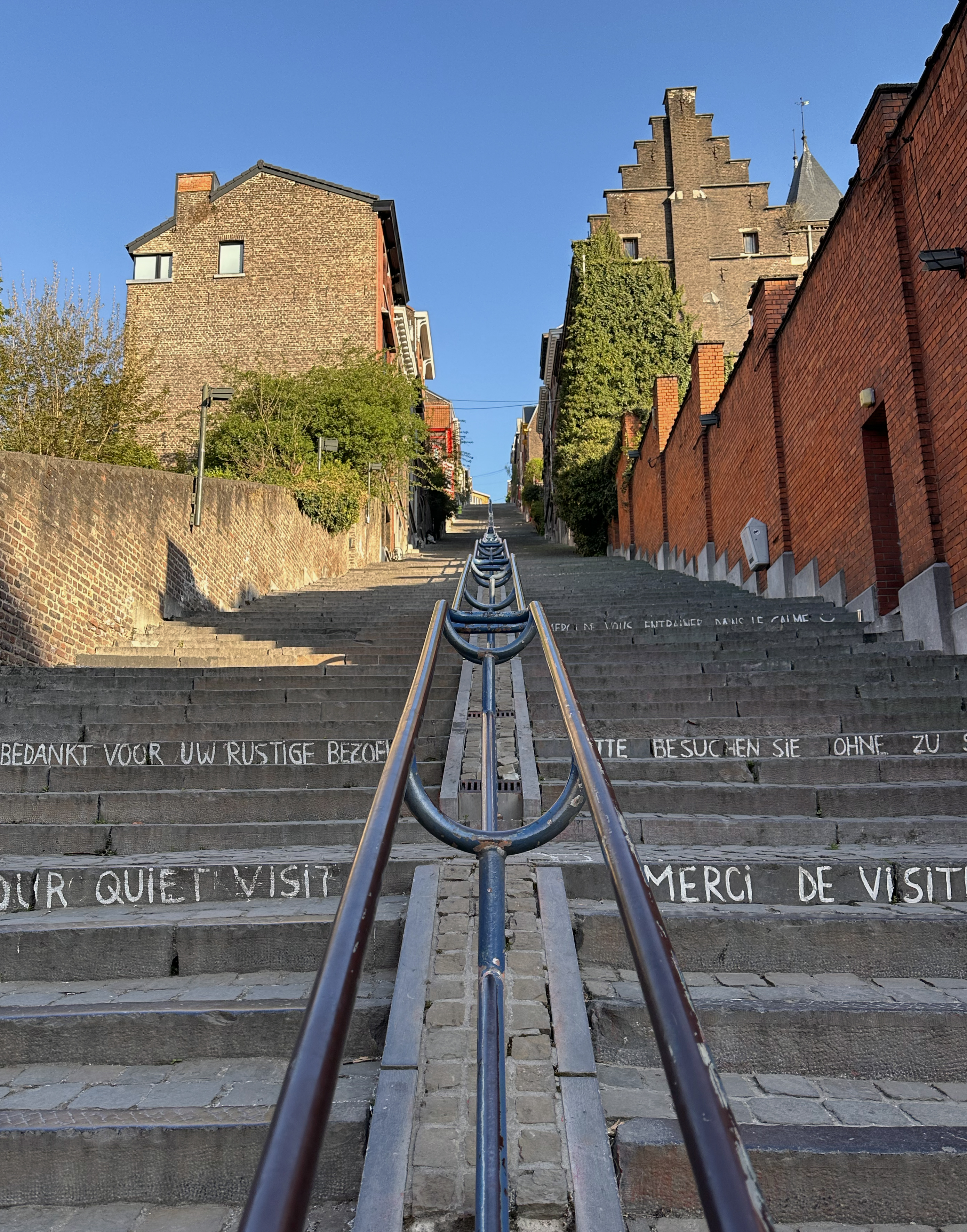The next morning, I left the Airbnb fairly early for some exploring. It was a perfect spot to crash for a night, and it would have been nice for an even longer stay. It’s called the “Cool Cool Room“, but the whole apartment is so creatively designed, with a gorgeous terrace! It does have quite a few stairs, so I’d recommend traveling with a backpack here. It was located a very short walk from the Montagne de Bueren, which was part of the reason I’d wanted to spend some time in Liège to begin with. My logic was that since these high points didn’t require much effort, I should tack on the famous 30% incline, 374-step stairs.