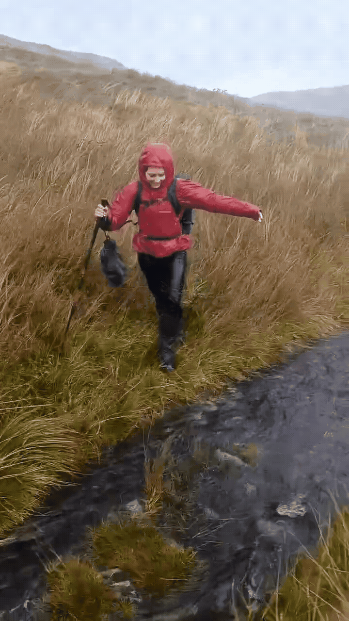 We decided to proceed to the bothy. No one else made that decision that day. It took over 3 hours, as we chose a path over a hill in an attempt to avoid having to swim there (given the levels of flooding). Still, we were often sinking knee deep in muddy, grassy puddles, and the wind + rain combo made me wish I’d brought along a face shield from pandemic days. I don’t think I’ve ever been so happy to see a basic house in the middle of nowhere (and it wasn’t just because there were cute cows out front to greet us). Still, it took probably another 30 minutes to make it the last 25 meters. This is because there is a river to cross…and the flow was so strong that it took a bit to determine the safest spot to cross. We were also looking for a path that wouldn’t involve drenching our shoes even further…but soon gave that up. The GIF doesn’t depict that river. We were too tired, and the wind and rain were too strong to try operating a touchscreen camera phone anyway.