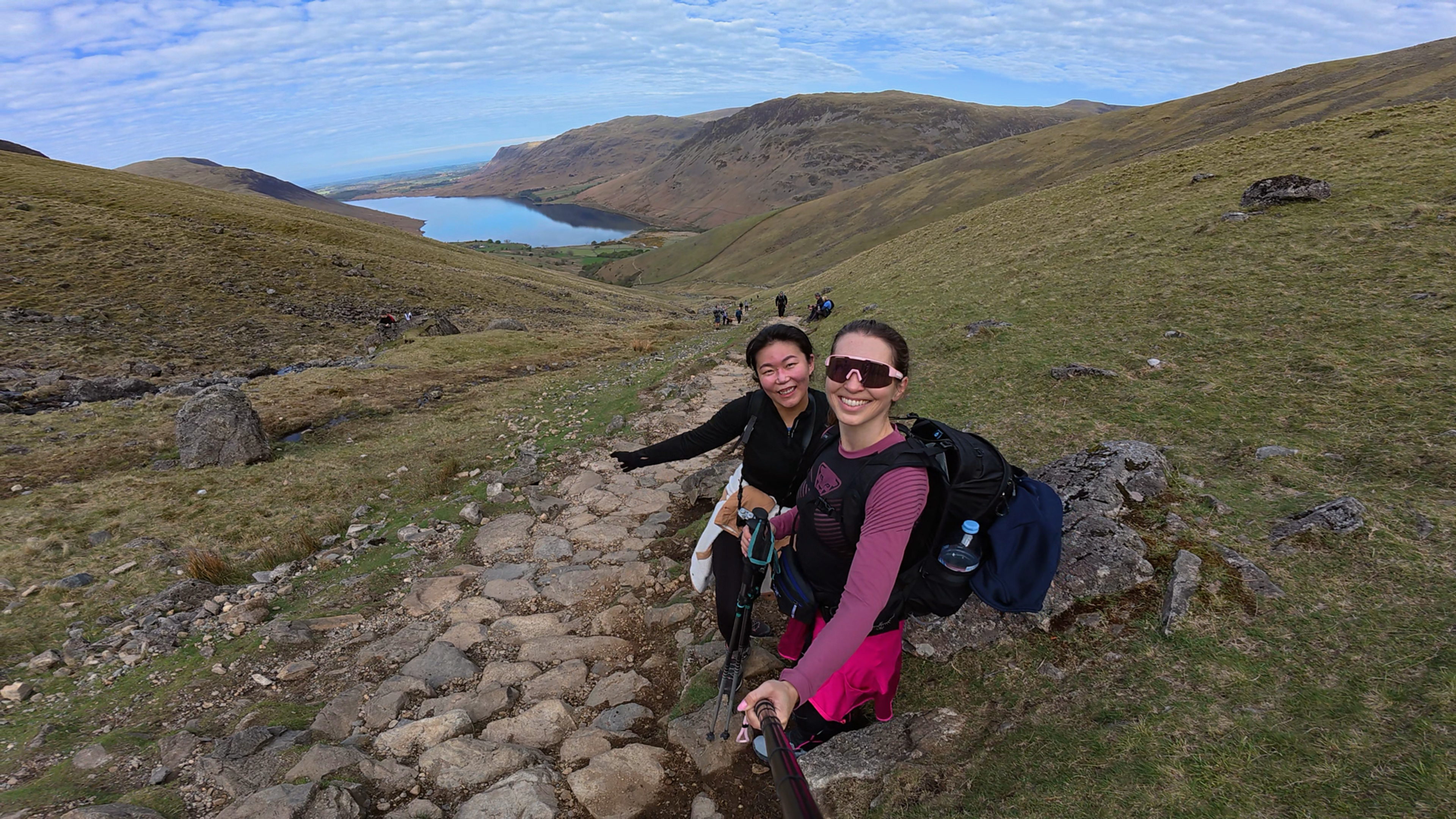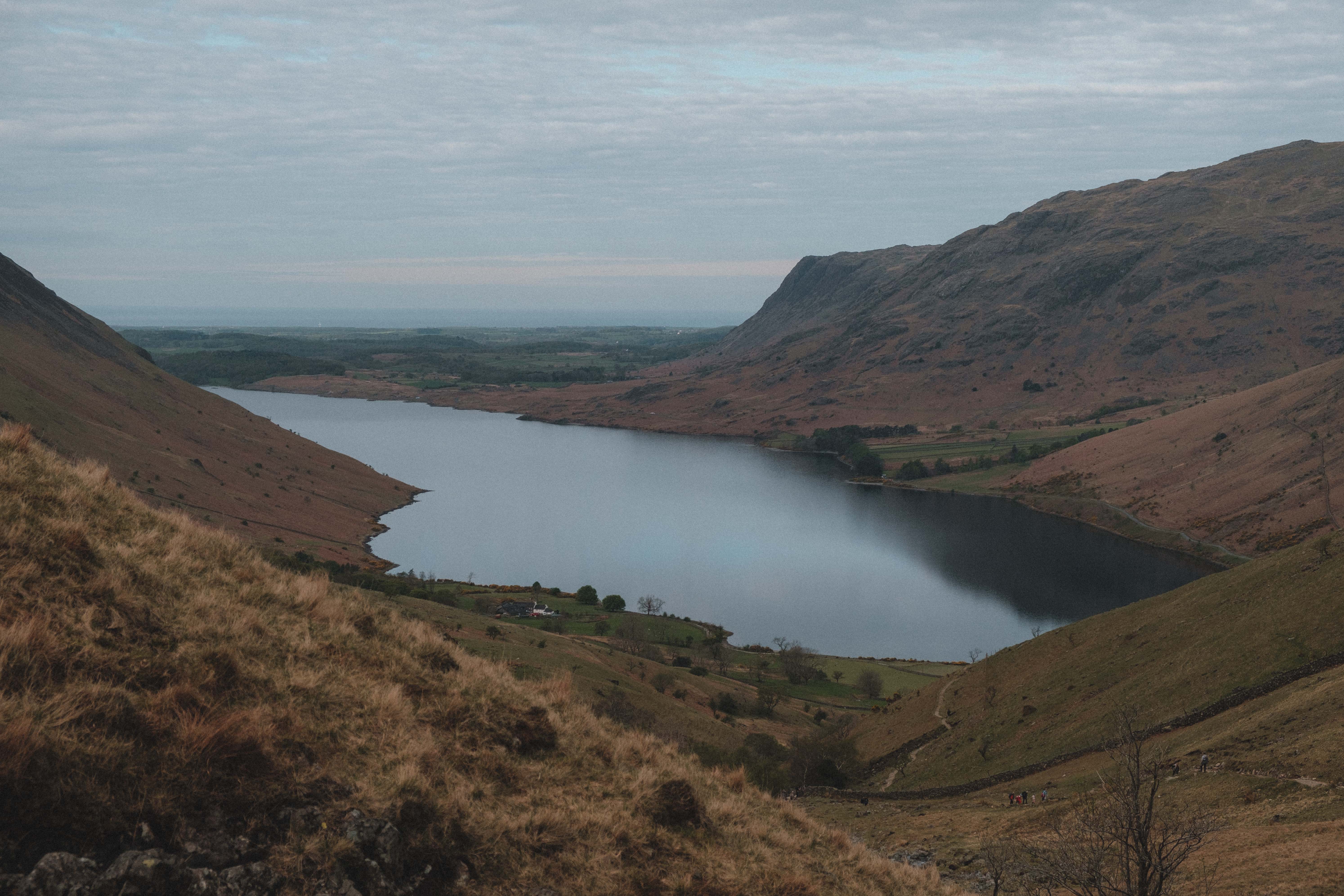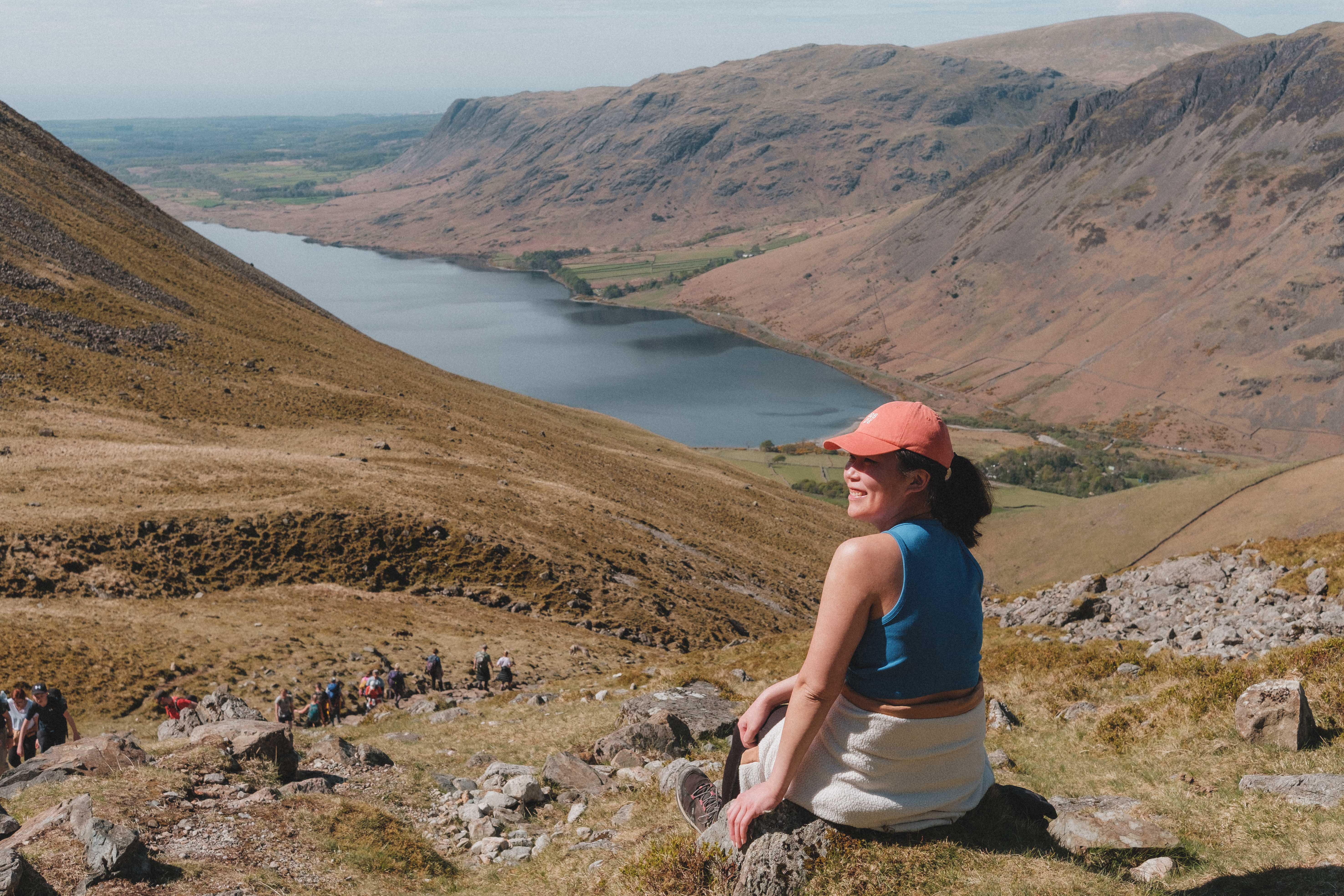Right from the start of this hike, the views open up over Wast Water, the lake we’d driven along on the way in. There is one uneventful river crossing with plenty of boulders to walk across to stay dry, then it just keeps going up. I tried to film some clips on the action camera along the way, mainly for the YouTube channel I’m working on. I still haven’t gotten the hang of what to say while out of breath, walking up a mountain, so I found myself repeating our destination: “THE HIGHEST POINT IN ENGLAND”. It became a sort of motivational phrase that turned into a delirious joke by summit time.