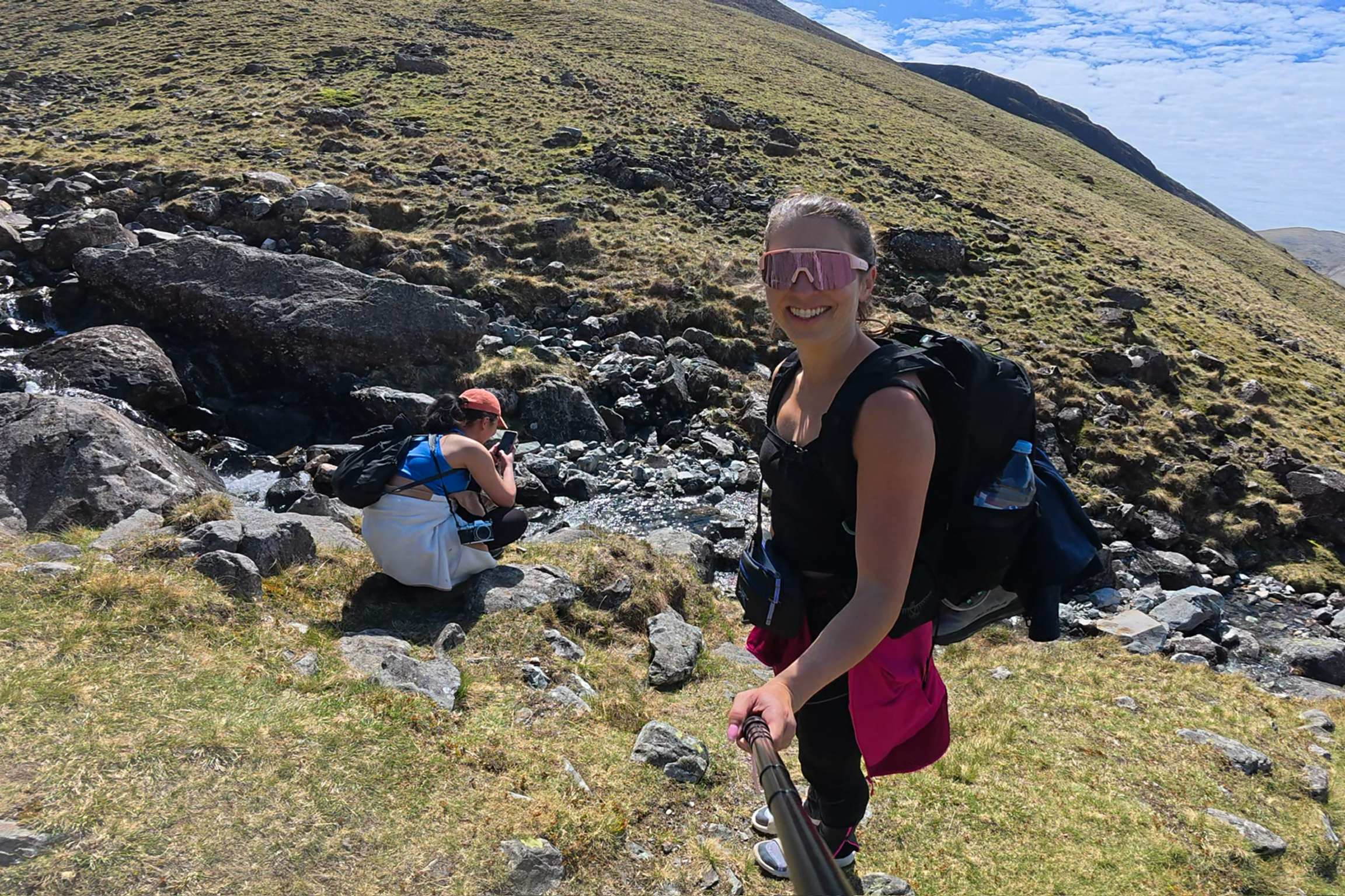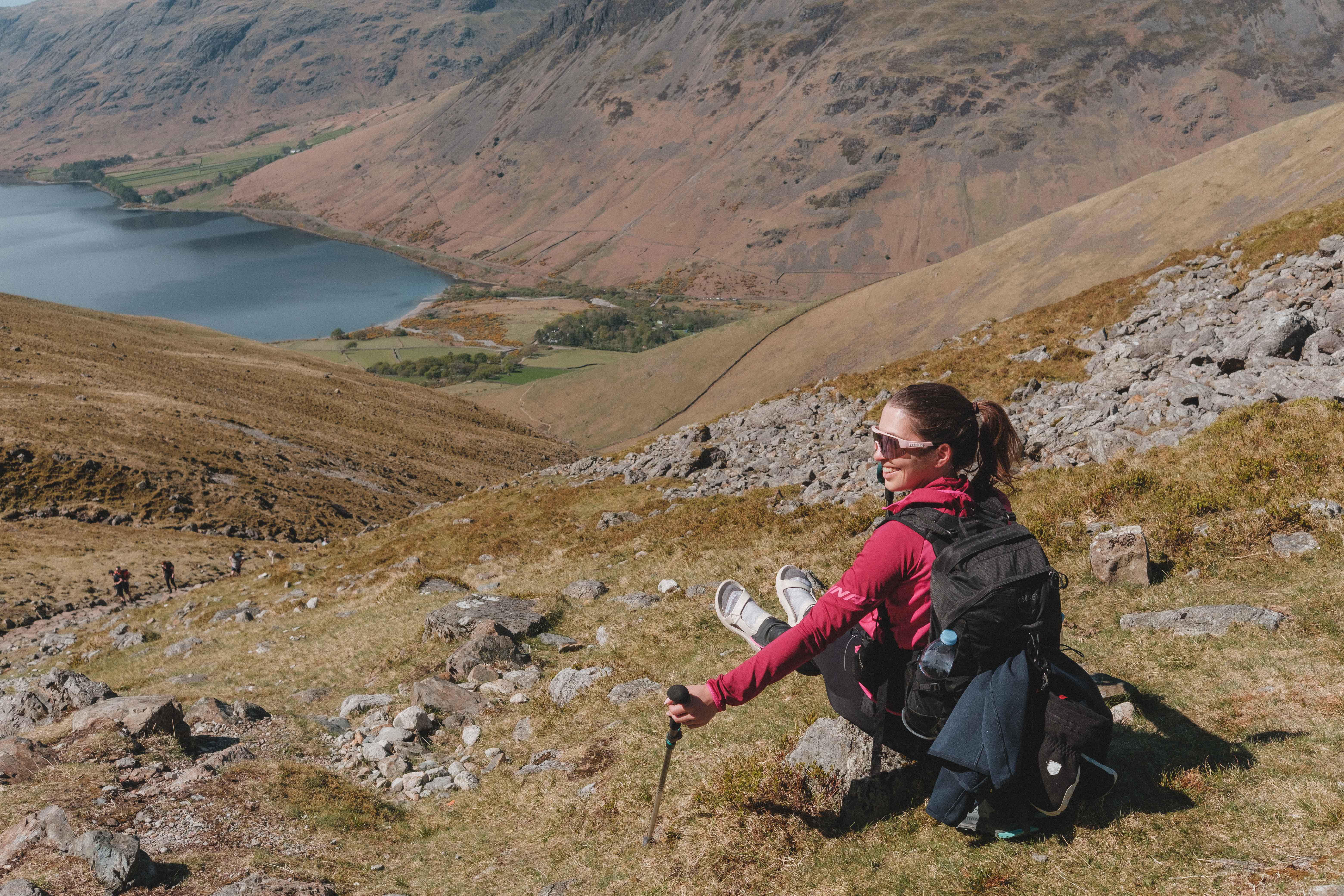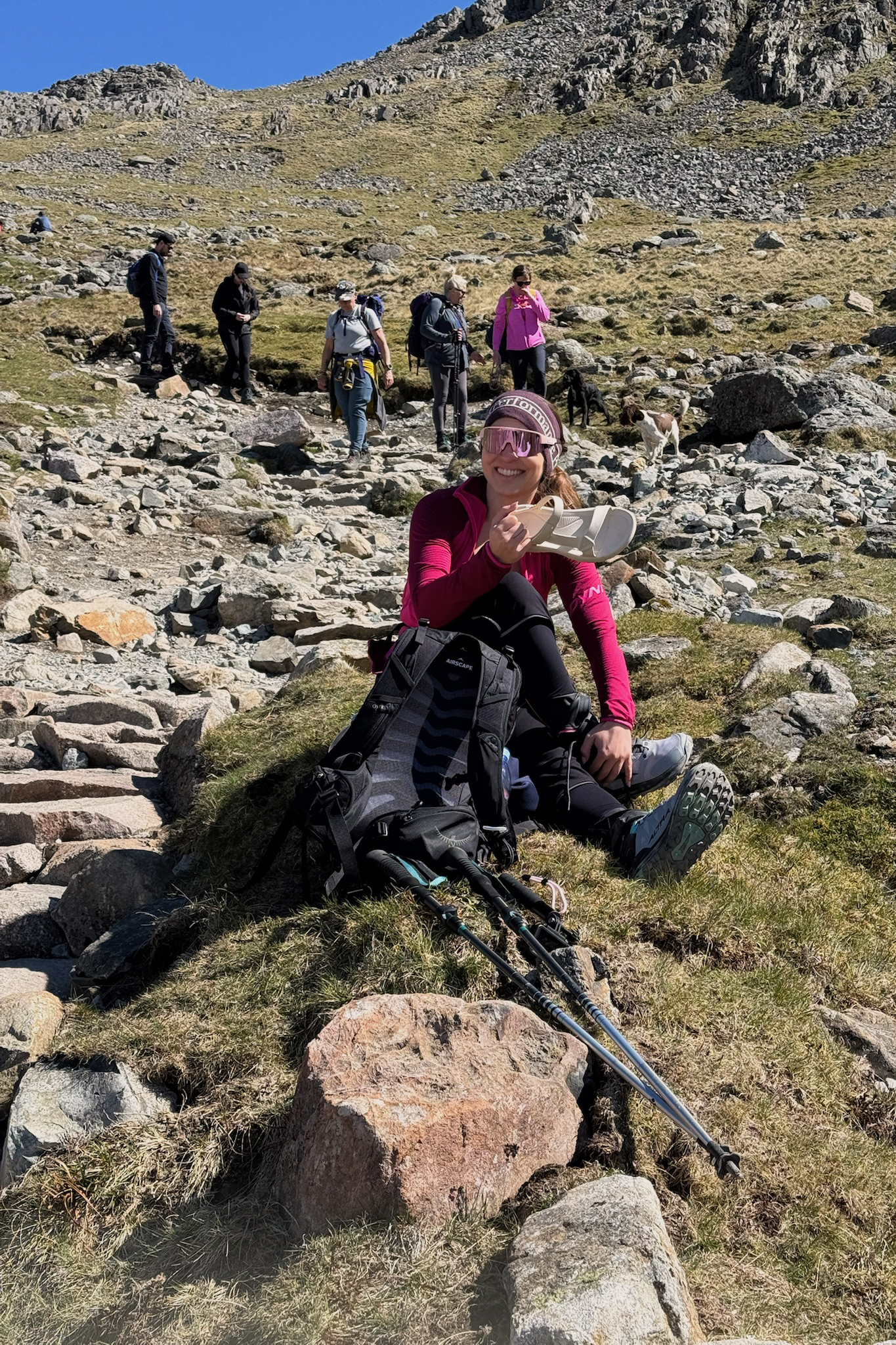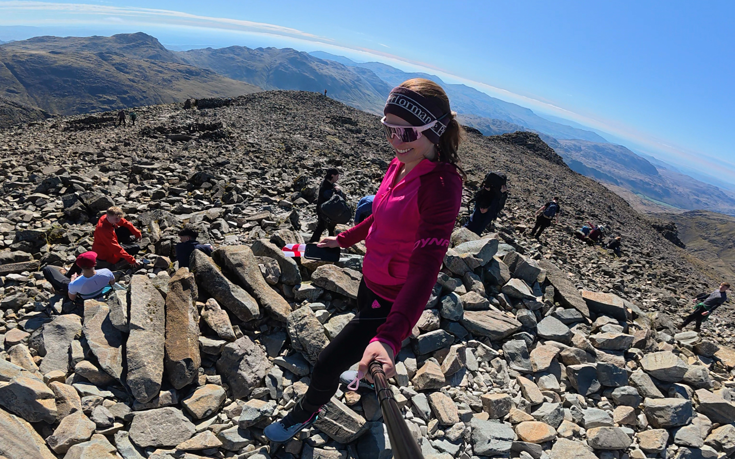 Right from the start of this hike, the views open up over Wast Water, the lake we’d driven along on the way in. There is one uneventful river crossing with plenty of boulders to walk across to stay dry, then it just keeps going up. I tried to film some clips on the action camera along the way, mainly for the YouTube channel I’m working on. I still haven’t gotten the hang of what to say while out of breath, walking up a mountain, so I found myself repeating our destination: “THE HIGHEST POINT IN ENGLAND”. It became a sort of motivational phrase that turned into a delirious joke by summit time.