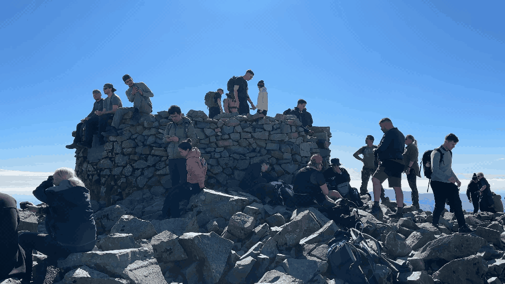 At this point, it feels like you’re nearly at the top, but there’s still more to go. We powered through and stood on the summit around 2 hours in, after tapping the trig point. I heard several people telling one another at the trig point “this is the real summit, we need to tap it!” While it is meant to be good luck to tap the trig point, and I did so myself…it’s not reeeeally the highest point! The trig points were built as part of efforts dating back to 1935 to “retriangulate” Great Britain. It helped to built more accurate maps, and they’re generally placed on or close to mountains’ summits. In the case of Scafell Pike, the real summit is somewhere under the massive summit cairn you can walk on. So, it’s worth popping up there for your summit photos! (:
