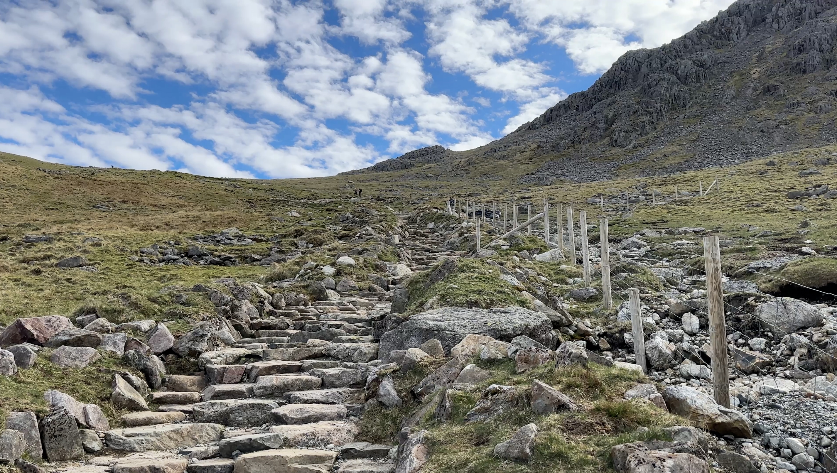The shortest and most popular way up to Scafell Pike is from Wasdale Head. The AllTrails map can be found here. It’s a 5.8-mile (9.3 km) out-and-back with ~3,000 feet (~915 meters) of elevation gain. Essentially, you are gaining just over 1,000 feet per mile, without any real “active recovery” flat sections. The trail is very well-maintained and non-technical, though. There are a lot of ways to tackle other peaks as a loop, if you’re collecting the 214 Wainwrights.