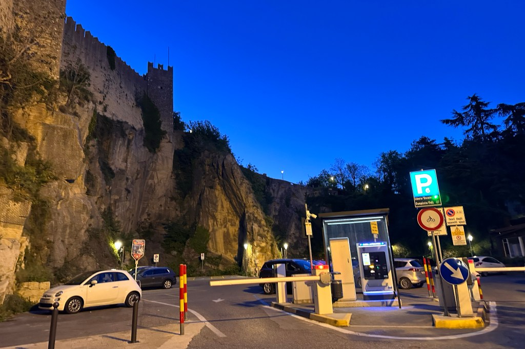 I flew into Rimini Airport on May 1st, and the plan was to take the bus into San Marino, then back again the following late morning before an afternoon train to Rome. With the change in plans, I’d condensed the San Marino visit a bit, and I’d need to see Monte Titano (the highest point) on May 1st, as opening hours were only from 9 to 5. That meant needing a car, as the bus wouldn’t allow for enough time before the towers closed. I knew there were three days to avoid Monte Titano (when at least La Cesta, the tallest tower, is closed): January 1, November 2, and December 25. However, on other Italian public holidays…most car rental companies are closed for pickups. I only found one in the whole Rimini area that was open: U-Save. They have a shuttle to pick you up from the airport, with very nice people working there! It worked out perfectly, and I headed up to this parking area to begin the walk to the three towers: Guaita (first), Cesta (second), and Montale (third). I would recommend bringing euro coins, as I was having some trouble with the credit card and contactless payment options in the parking lot (tried US and UK cards).