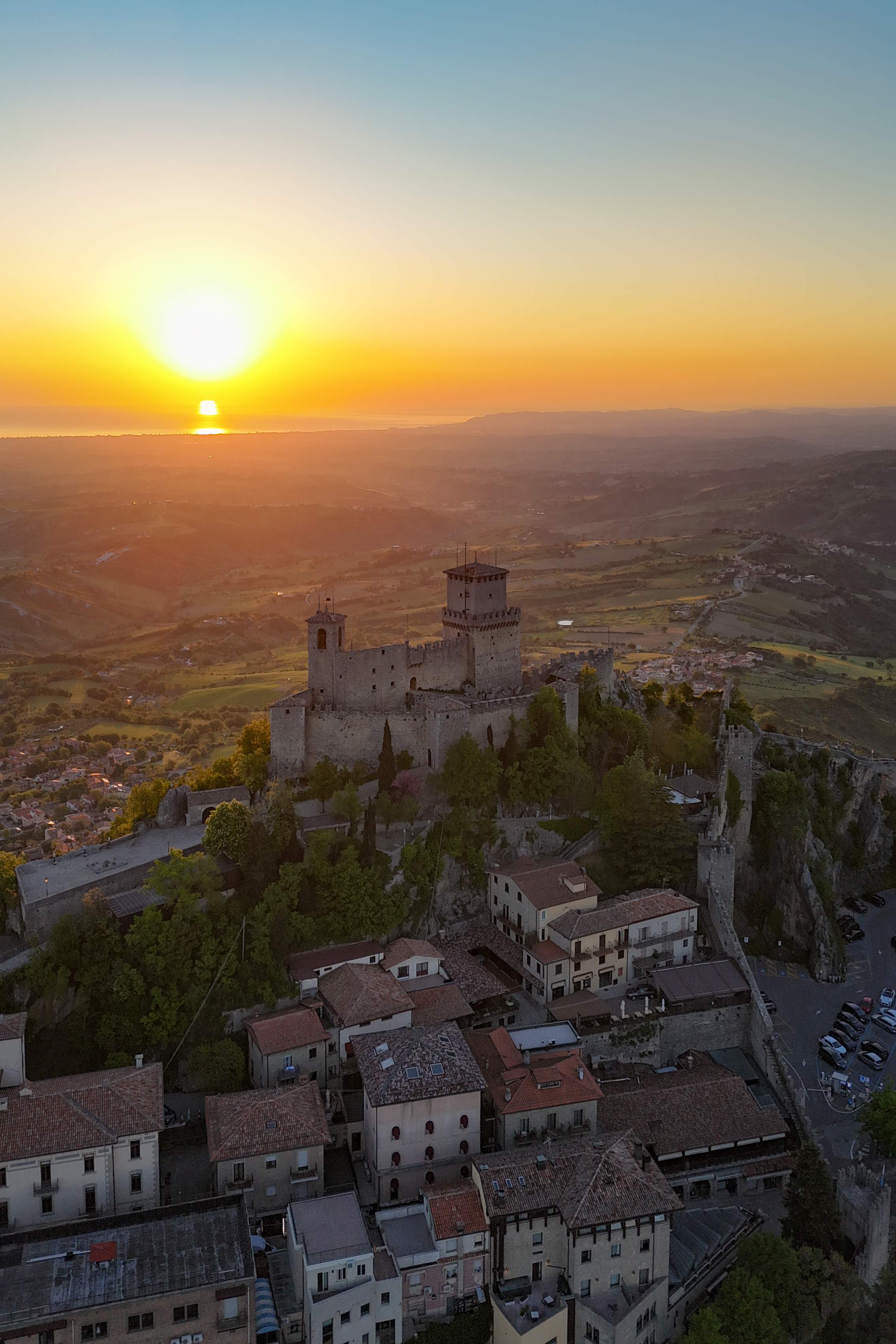 I was up a bit late for some work calls that evening, so when my alarm went off at 5am the next morning, I almost turned it off. Thankfully, my window was facing east, and I saw the most beautiful, pink-tinged horizon through the blinds. I jumped out of bed, got ready (barely) in 10 minutes, and high-tailed it back up to Monte Titano. I opted for a parking lot close to what seemed like a good launch point for my drone. It ended up being free, possibly because I exited before 8am? Normally there’s a charge!