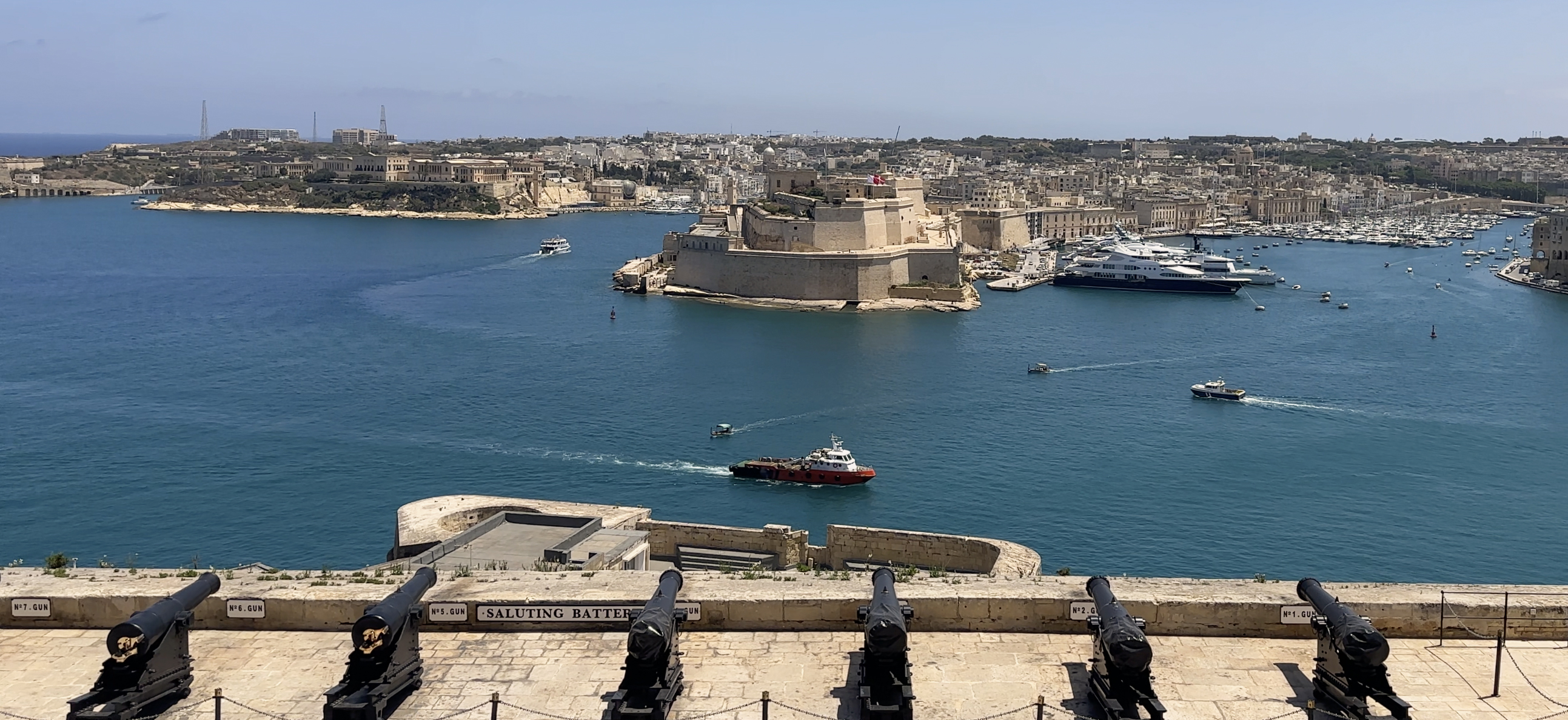 My walk then led me to the Saluting Battery, which had the largest crowds I’d seen in Malta thus far. There were people packed like sardines along the edge. What were they looking at, I wondered? Nothing was happening. Maybe I should have asked someone, but I went to find a bathroom instead. It was around 11:57 at that point. I popped out and found a seat along the side (the balcony was L-shaped) – why was no one here? There were sea views too!