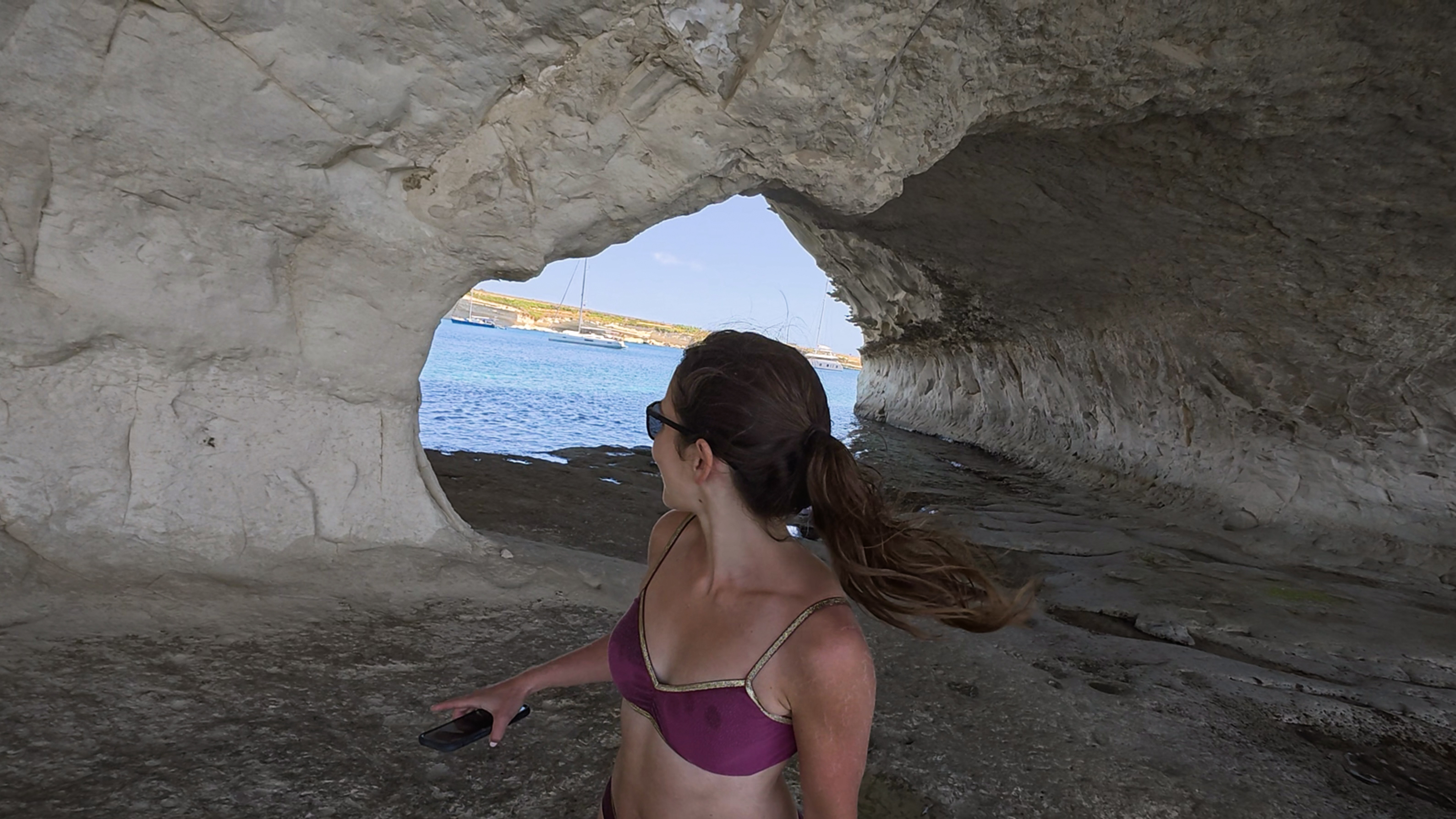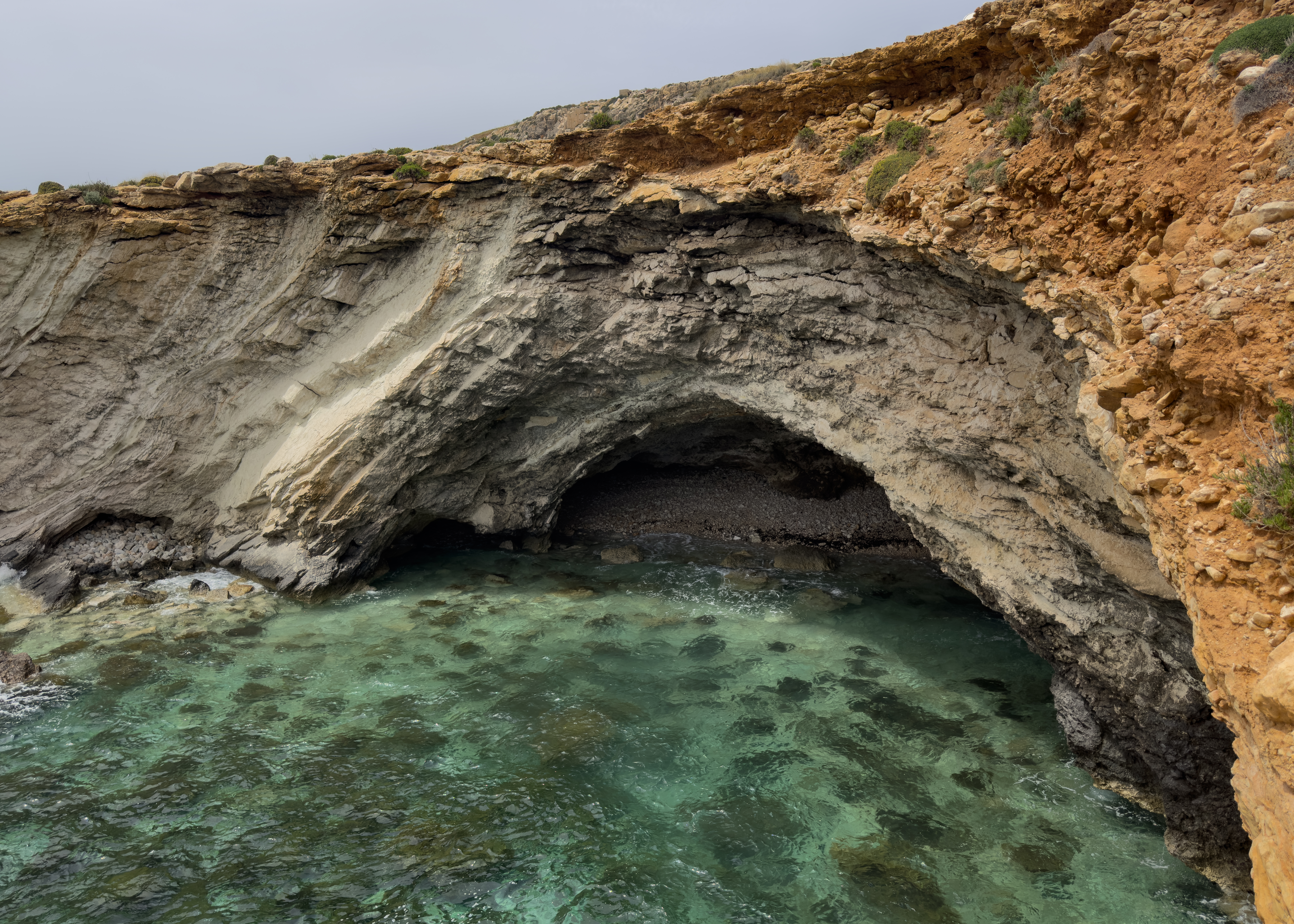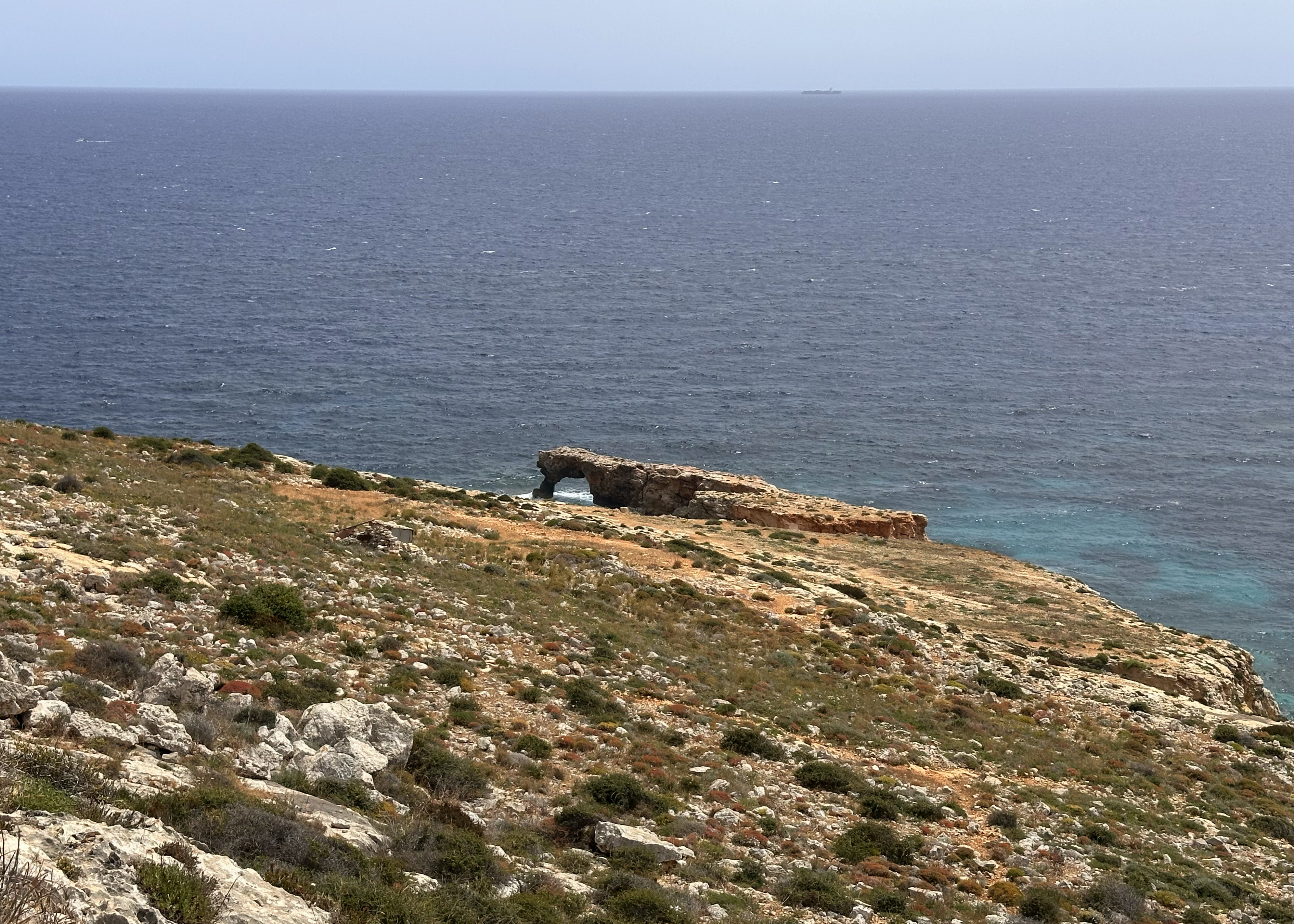 After Mnajdra, I saw a woman follow a side path that went along the cliffs, rather than returning back along the path toward Ħaġar Qim. I don’t think I would have noticed it if not for her…so thank you, stranger! There was a point where the path went pretty close to the edge, and I could see a stone arch in the distance.