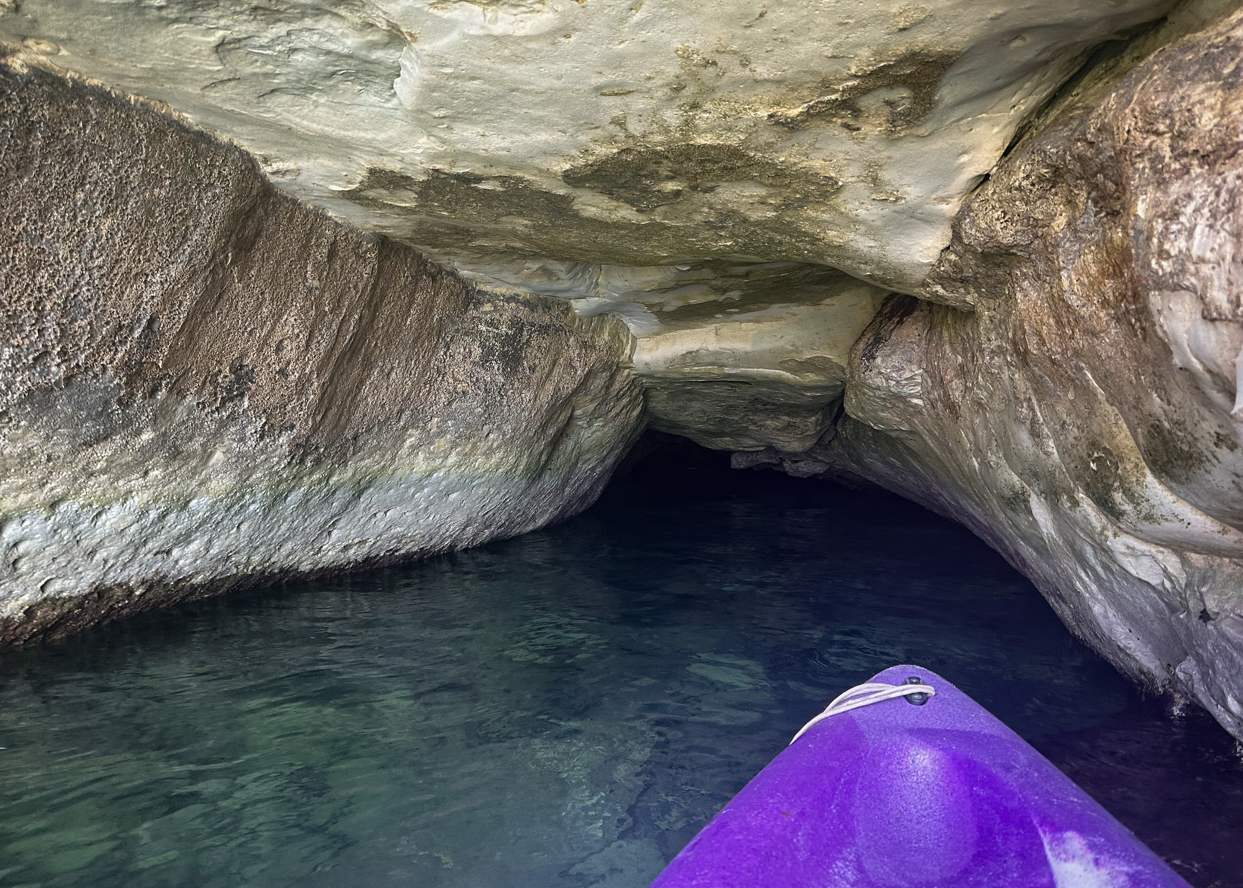 After that, there seemed to be a set of caves just around the corner, so I paddled toward them. As I got closer, it was clear that they 1) weren’t that interesting and 2) were way too rough to approach. I had phone signal, so I looked at my map and saw a cave I’d bookmarked around the next bend. It felt a bit far, but I’d made good progress and had only been paddling for 30 minutes. I continued.