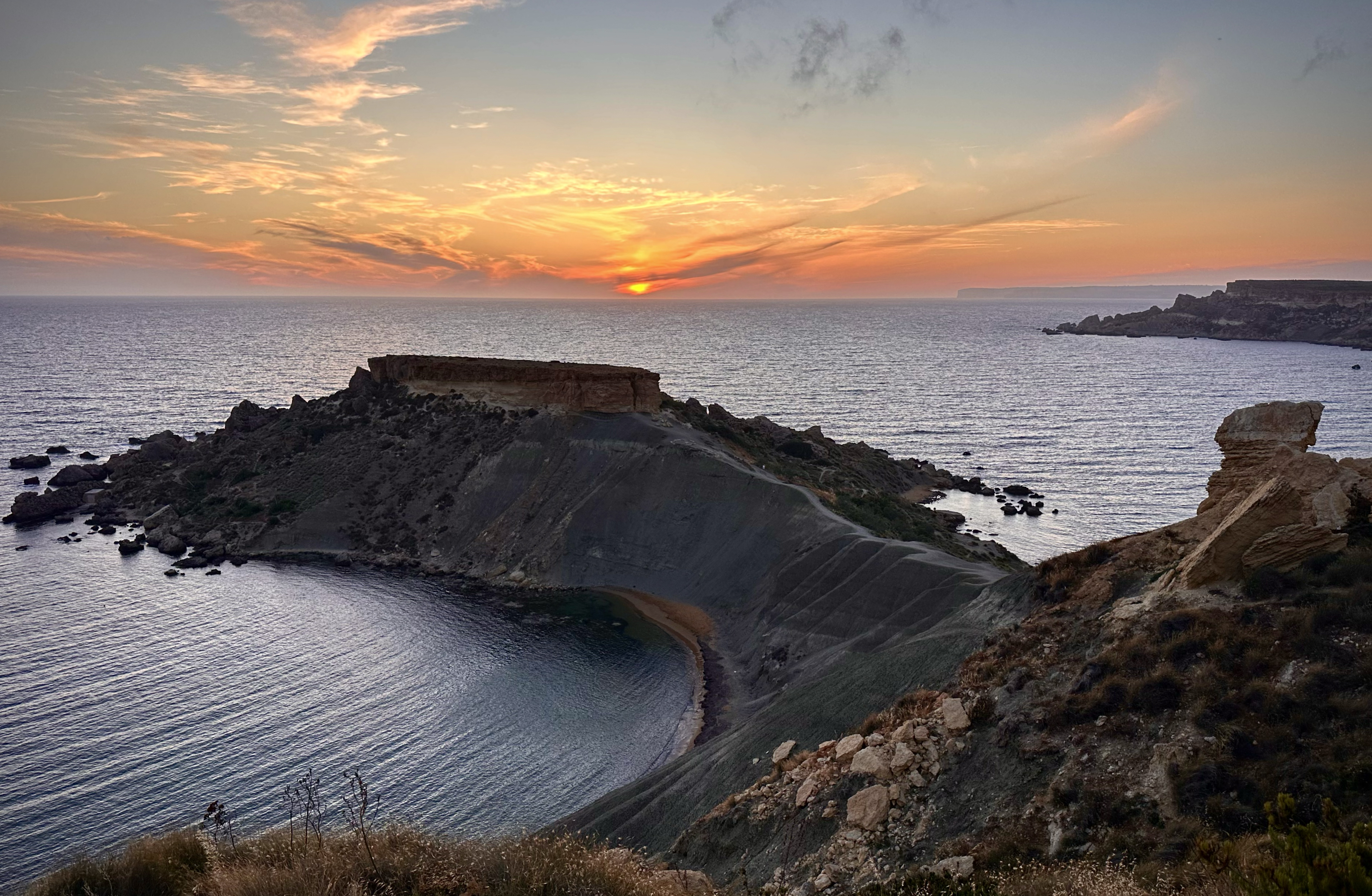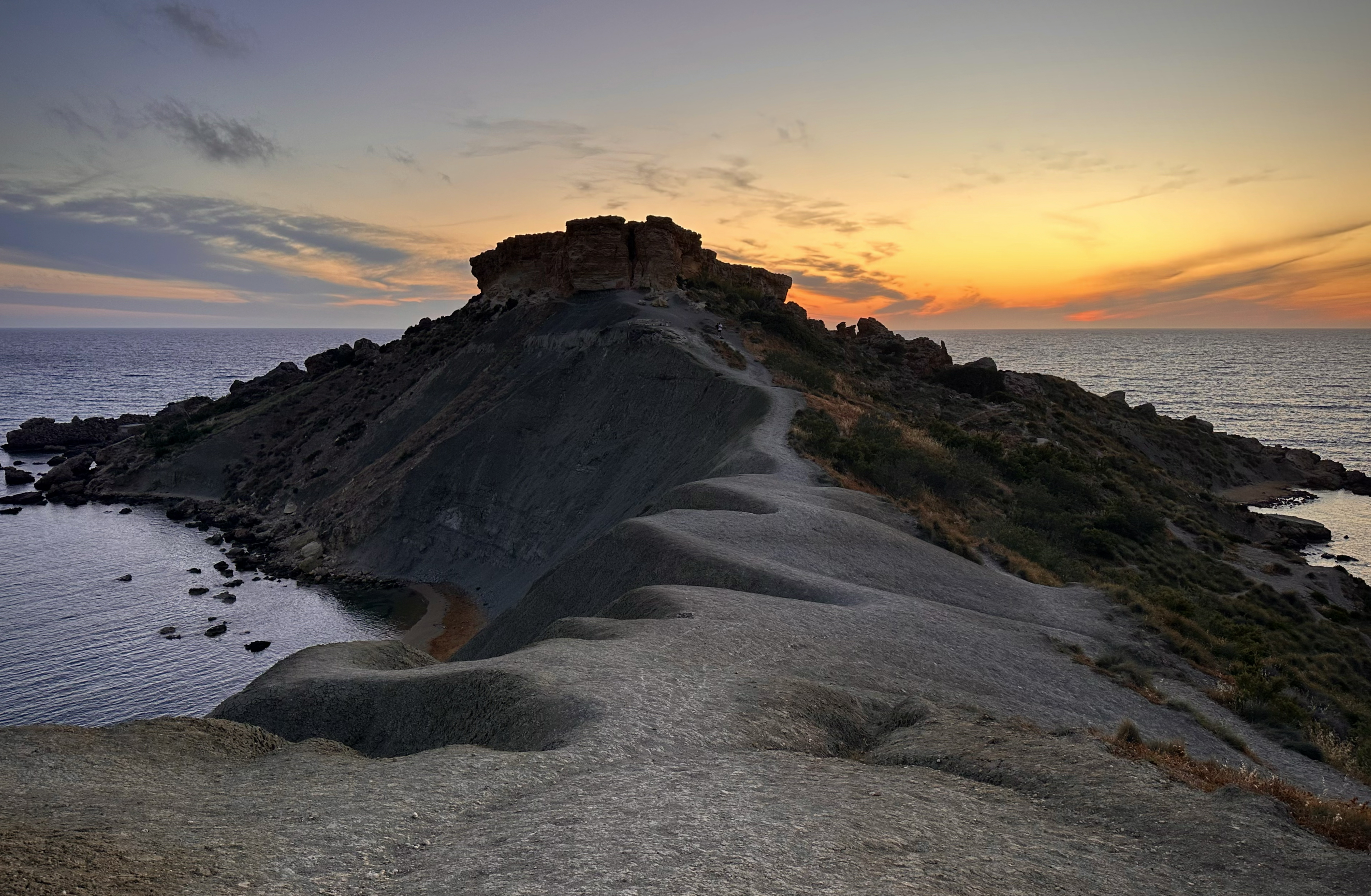 I relaxed there for a bit, but then decided there was still time to drive 20 minutes to the sunset spot I’d bookmarked just across the island, on the west side: Għajn Tuffieħa. Parking was easy, and I joined the path along the ridge toward the Clay Cliffs. The great thing about this place is that there isn’t one perfect sunset view. There are many different views along it, so I ended up taking a circular path that would leave me on the beach after the sun went down. This is another one of my favorite places in the world, possibly. It felt like a mix of Iceland and Hawaii. Such unreal formations and views.