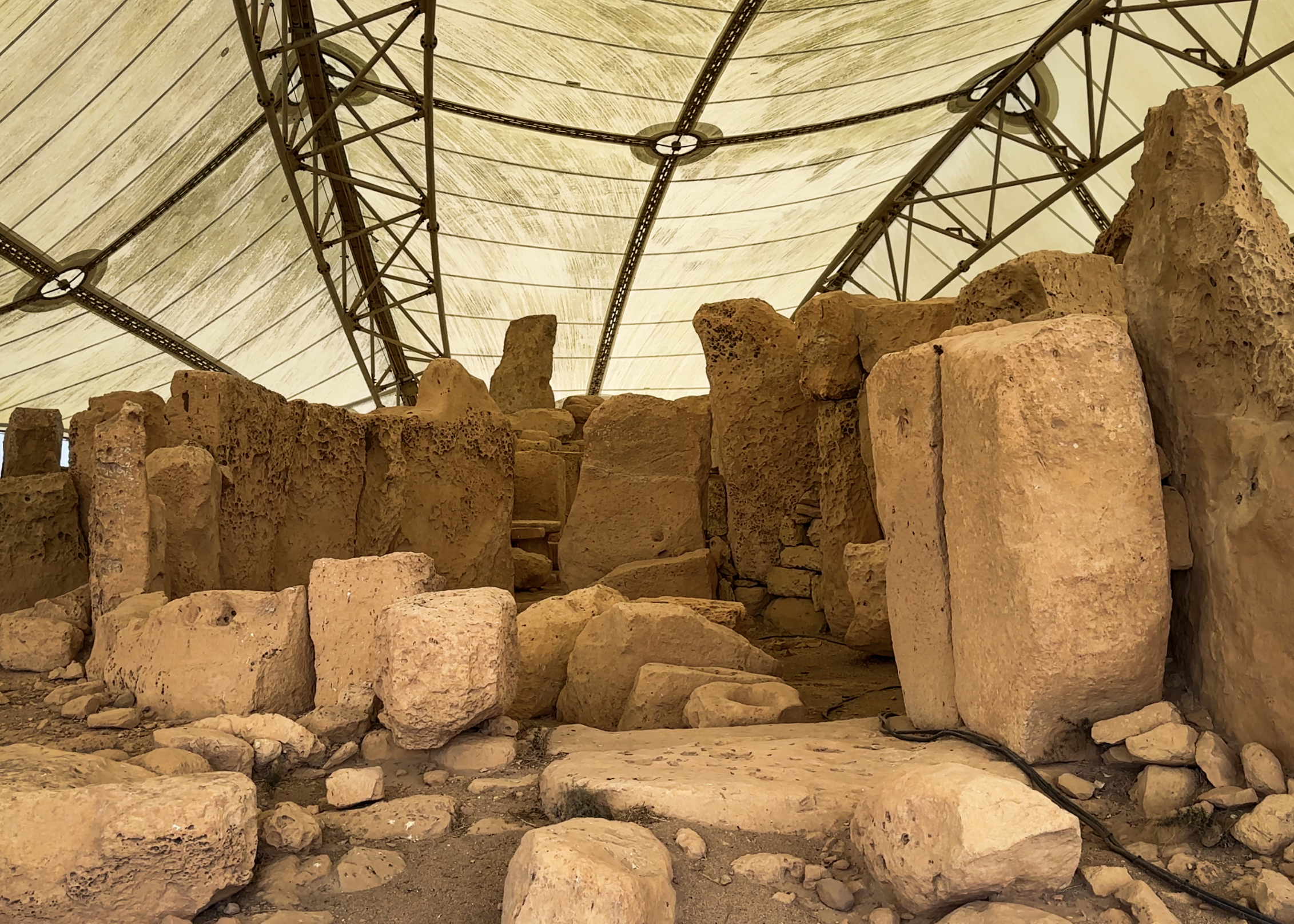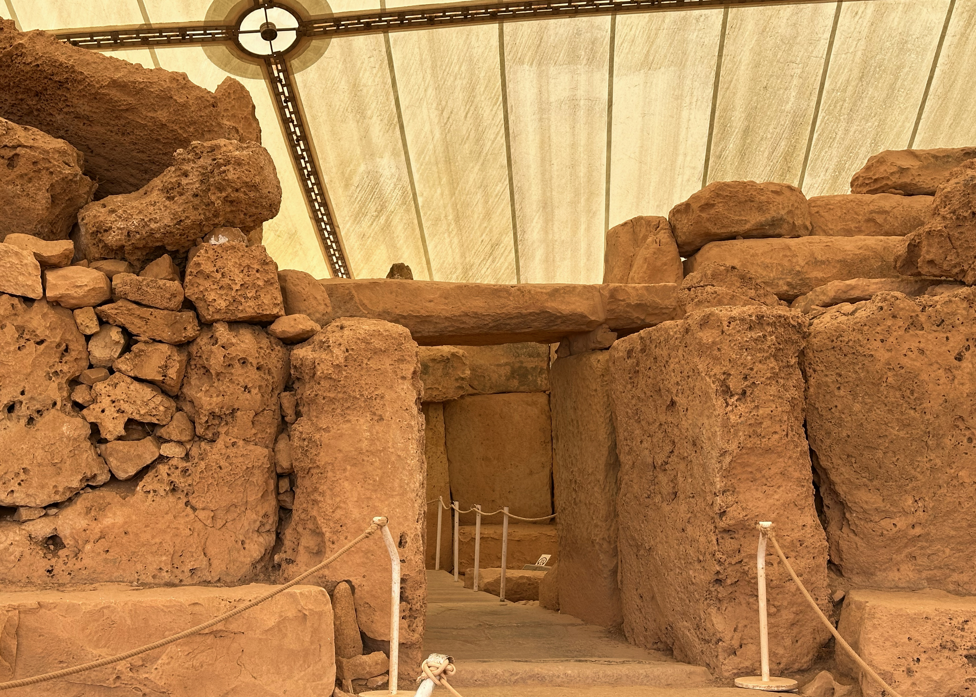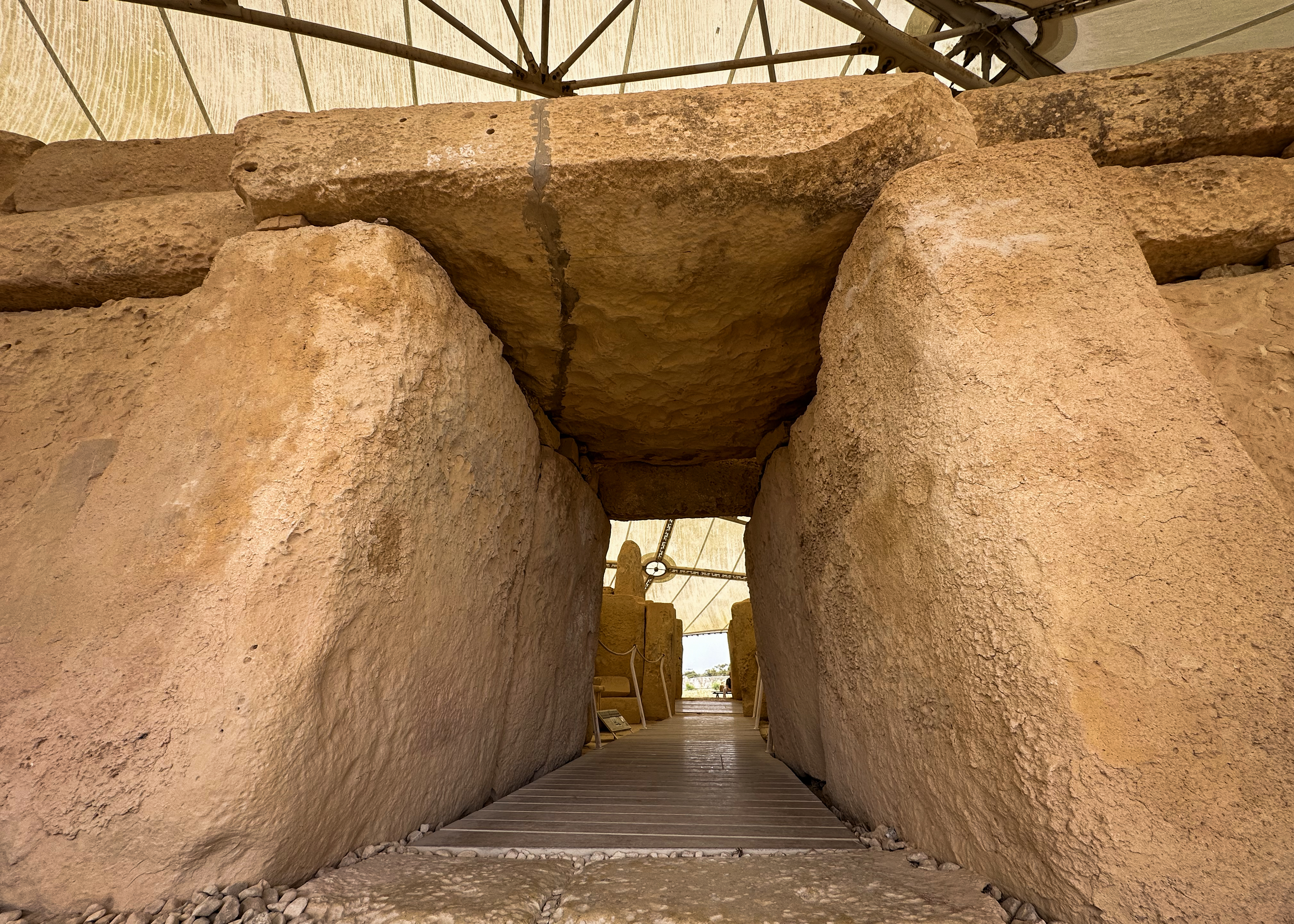 Both temple complexes had protective structures installed above them in 2008, as they were beginning to deteriorate quickly after their excavation that began in 1839. Before that, they were essentially buried under rubble, soil, and vegetation, particularly the South Temple of the Mnajdra. Those coverings protected them from fully deteriorating over their 5,000+-year existence. They were likely used for over 1,000 years by a neolithic society. That period from 4,100 to 2,500 BCE was known as the Temple period, which was followed by the Bronze Age until 700 BCE. While the Temple period started in 4,100 BCE, the first 500 years of it consisted of a transition from early farming communities. The earliest temples on the main island of Malta are these, and there’s another equally old on Gozo, the Ġgantija. The Tarxien temples came a few hundred years later. It’s apparently a mystery as to why the use of these temples stopped and architectural/cultural practices shifted completely, but it could have been related to environmental factors (not too many natural resources on this riverless, lakeless island) or population replacement (but seemingly not from war, as there is no evidence of mass graves or other signs of war).
