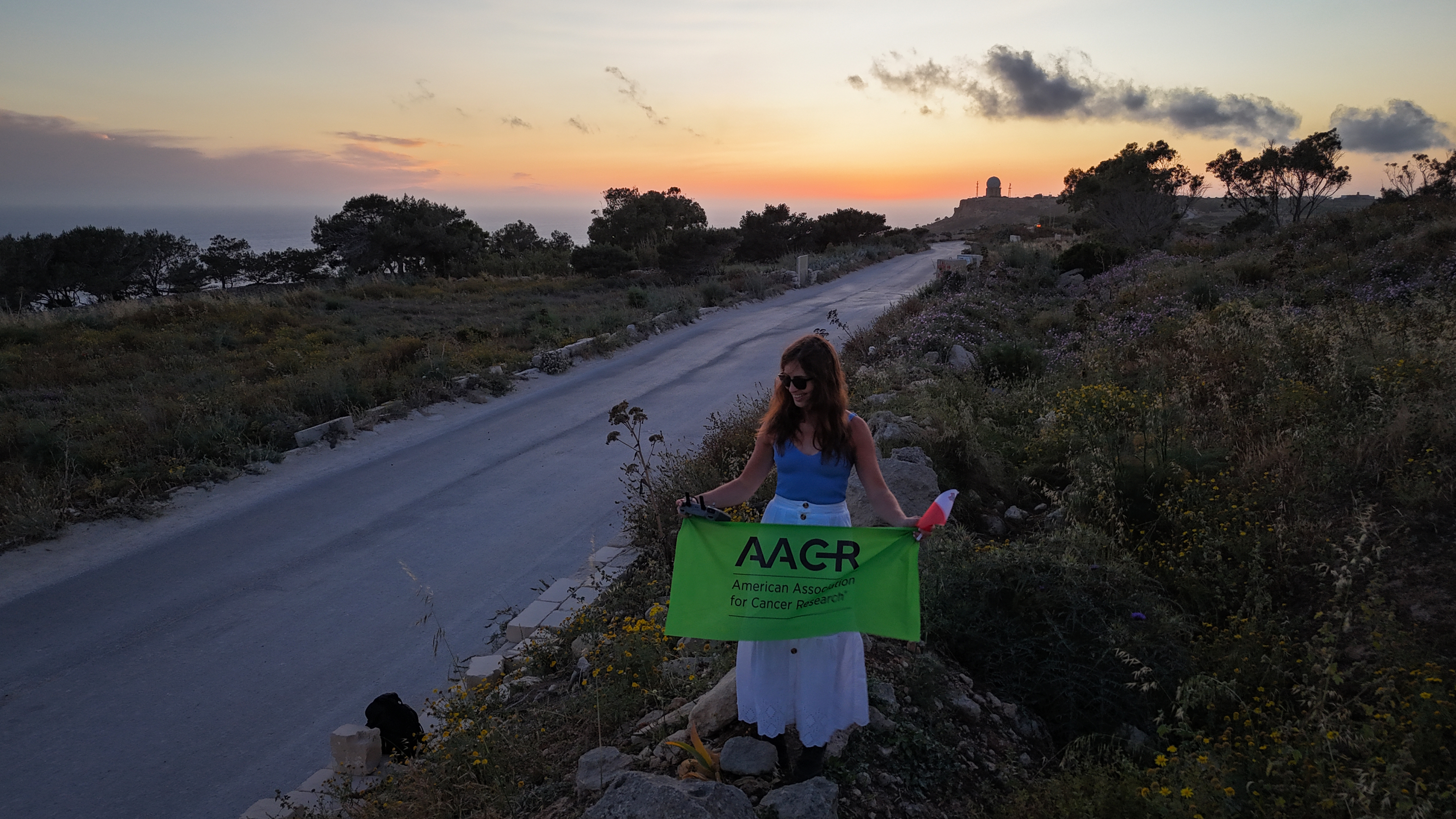The sun was getting really close to the horizon, and the sun would be setting in 15 minutes. I’d brought my camera but not my drone, and there was really nowhere to place a tripod up there. I walked as fast as possible back to my car 10 minutes away (still can’t run with the ankle cartilage situation), then pulled over closer to that spot. Two minutes to go!! I grabbed the drone, launched it, and headed back up to the 252.67m spot with the AACR and Malta flags.