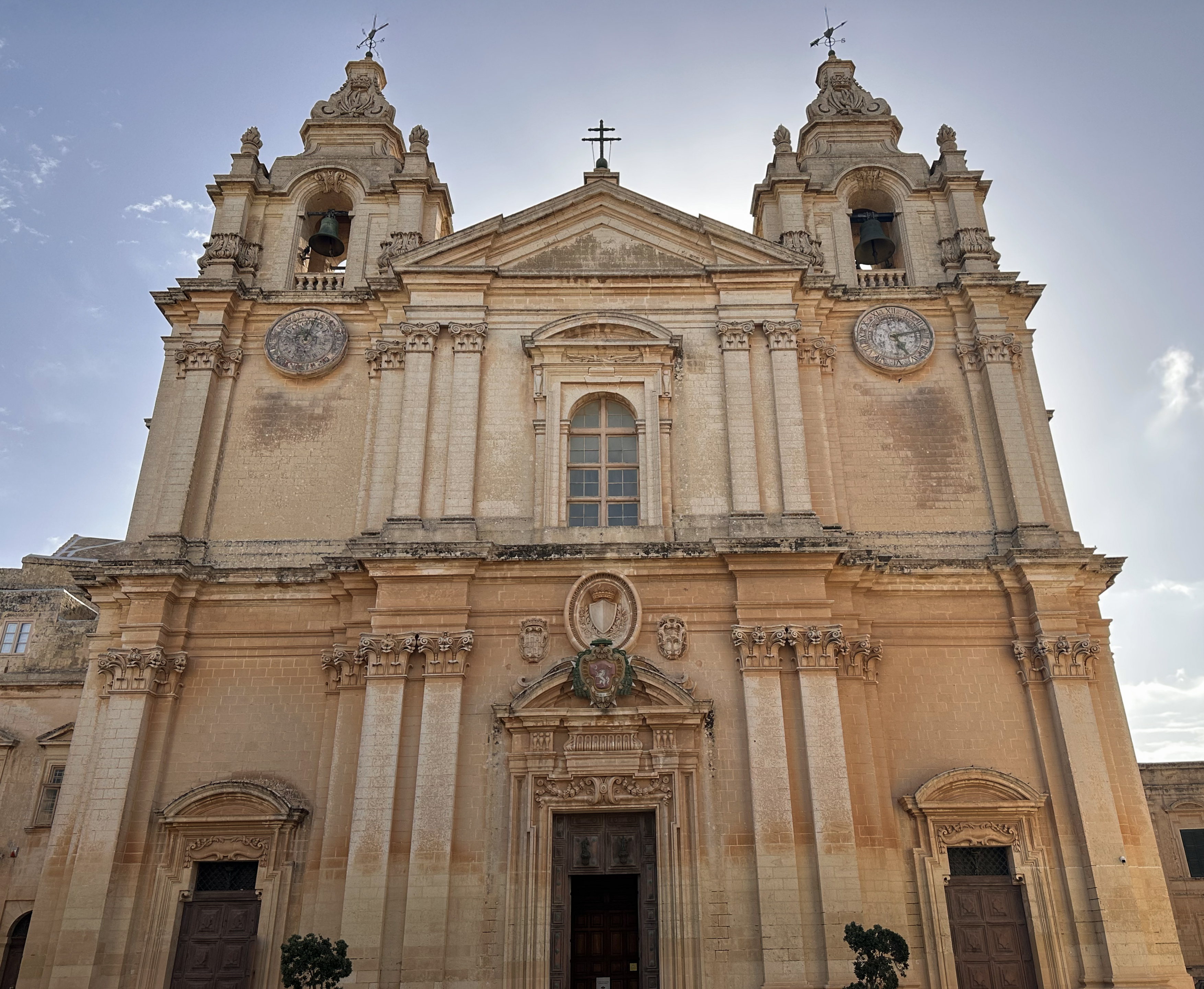 St. Paul’s Cathedral dates back to the 1100s, but after an earthquake destroyed it in 1693, it was rebuilt in its current, much different, Baroque style. There are two clocks on the face of it: