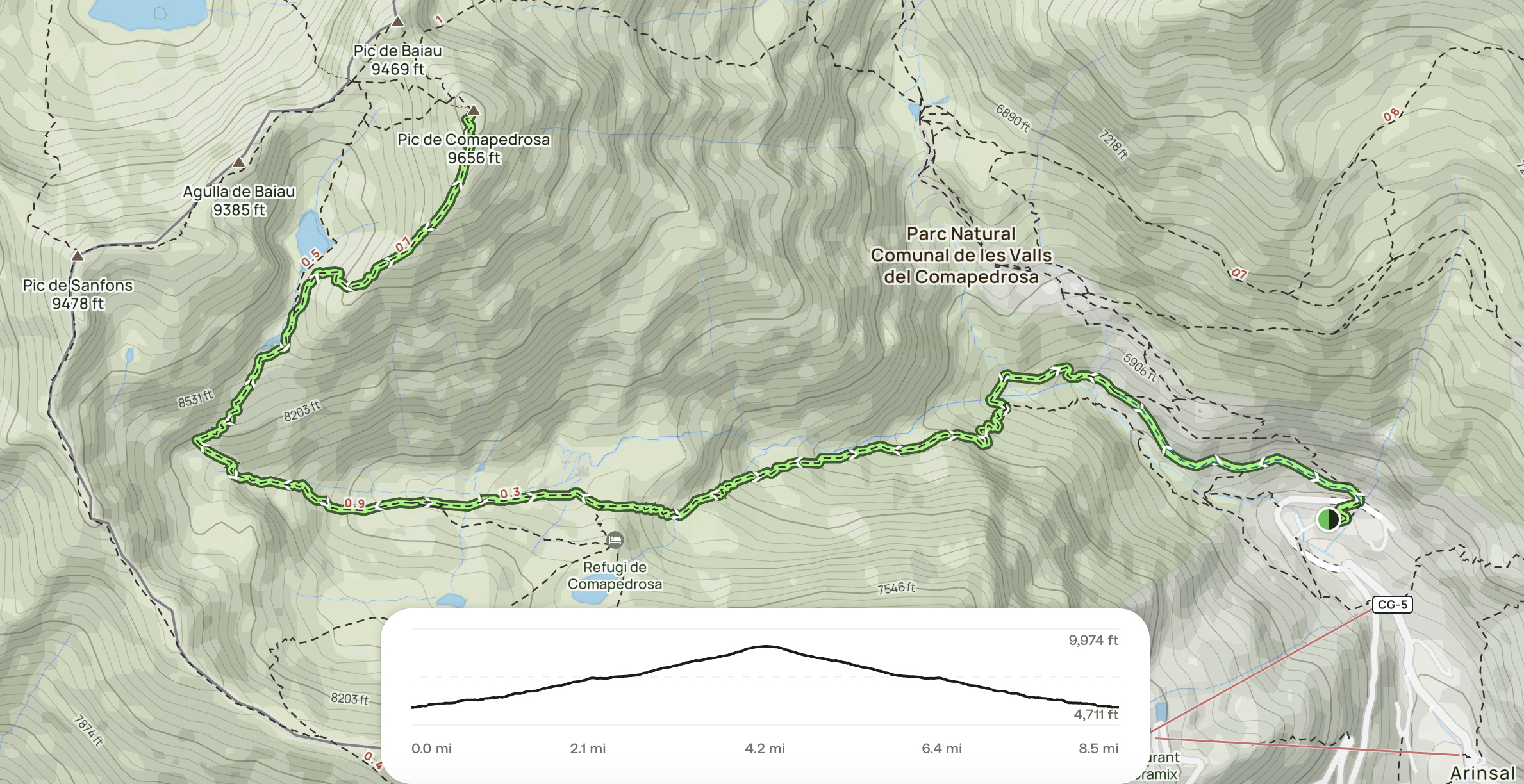 As you might see above, there is an option to turn this into a loop by continuing clockwise from the summit (or approaching the summit counterclockwise direction and stopping at or staying over in the hut before descending. There’s also an even longer option along the ridge further toward the edge of the map, directly along the border with Spain. Any of these variations adds pretty significant difficulty versus the main route. I opted for the common out-and-back this time around!