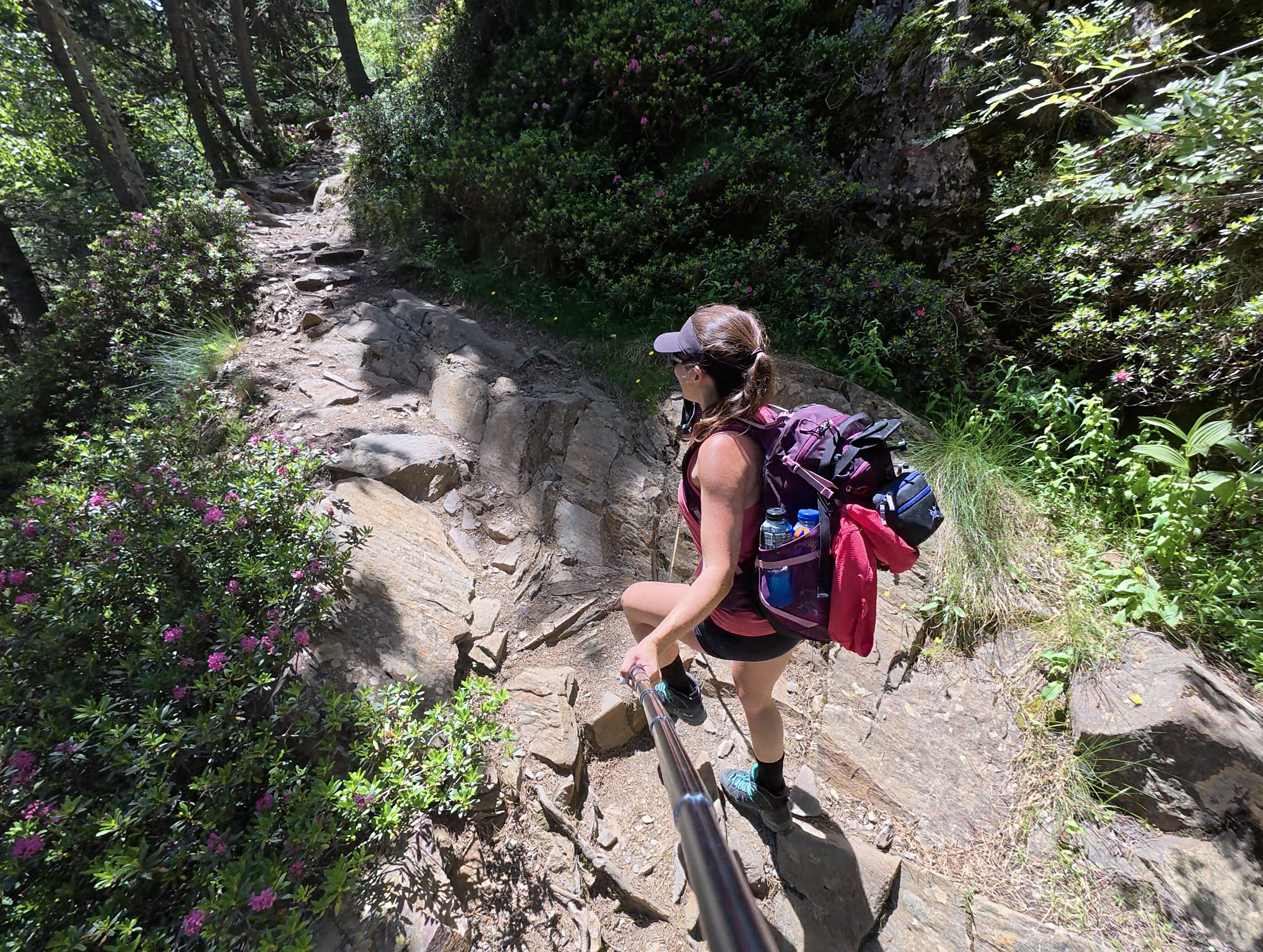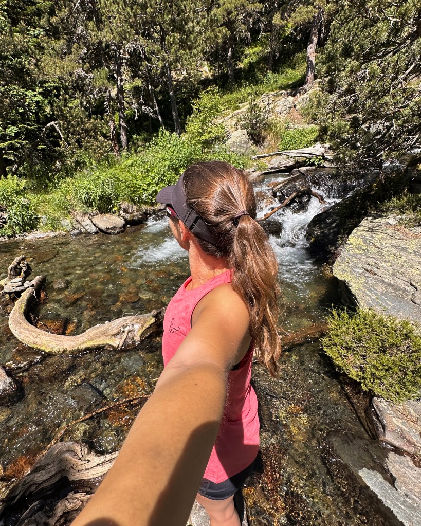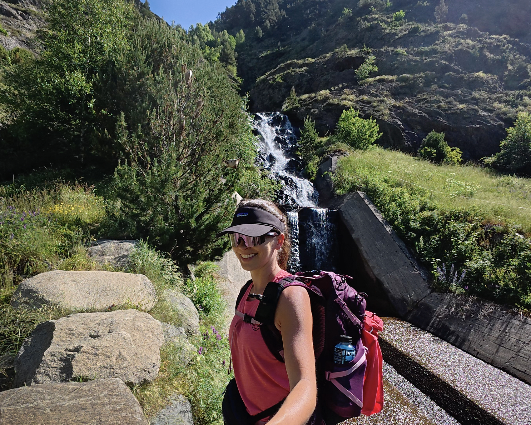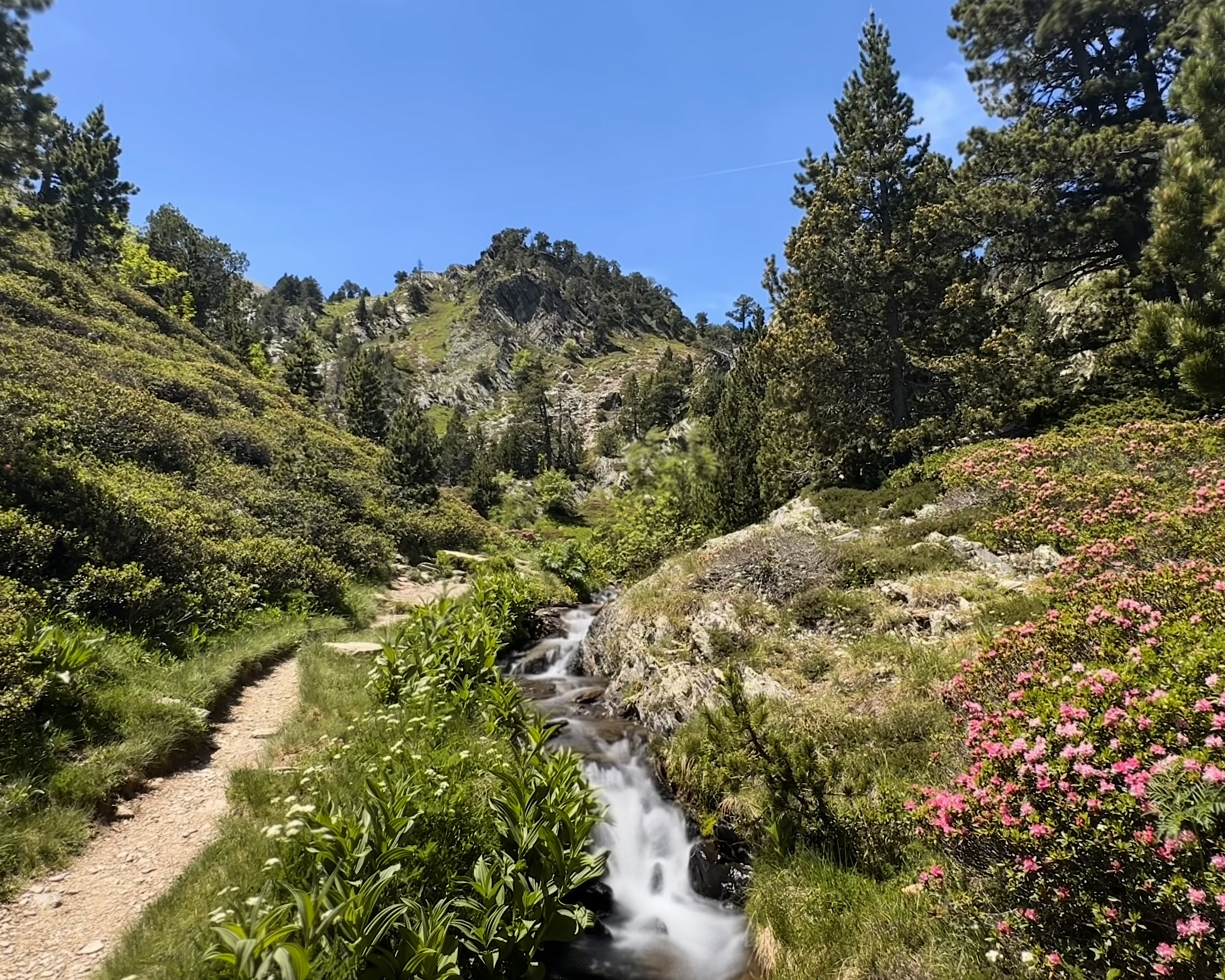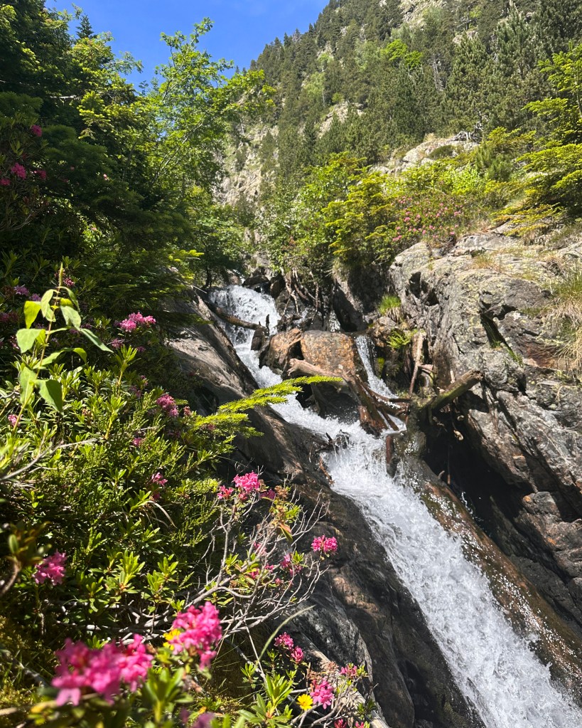 I had a Thursday night reservation for the Refugi Comapedrosa, and I planned to head up just in time for dinner. However, given the heat, I opted for an earlier start. After a quick stop to buy electrolytes I’d forgotten to pack, I parked at Hotel Yomo Patagonia, which was right by the trail start and had free overnight parking (when I was there, at least). The early trail is gradual, first passing by a waterfall and then heading up through the trees.