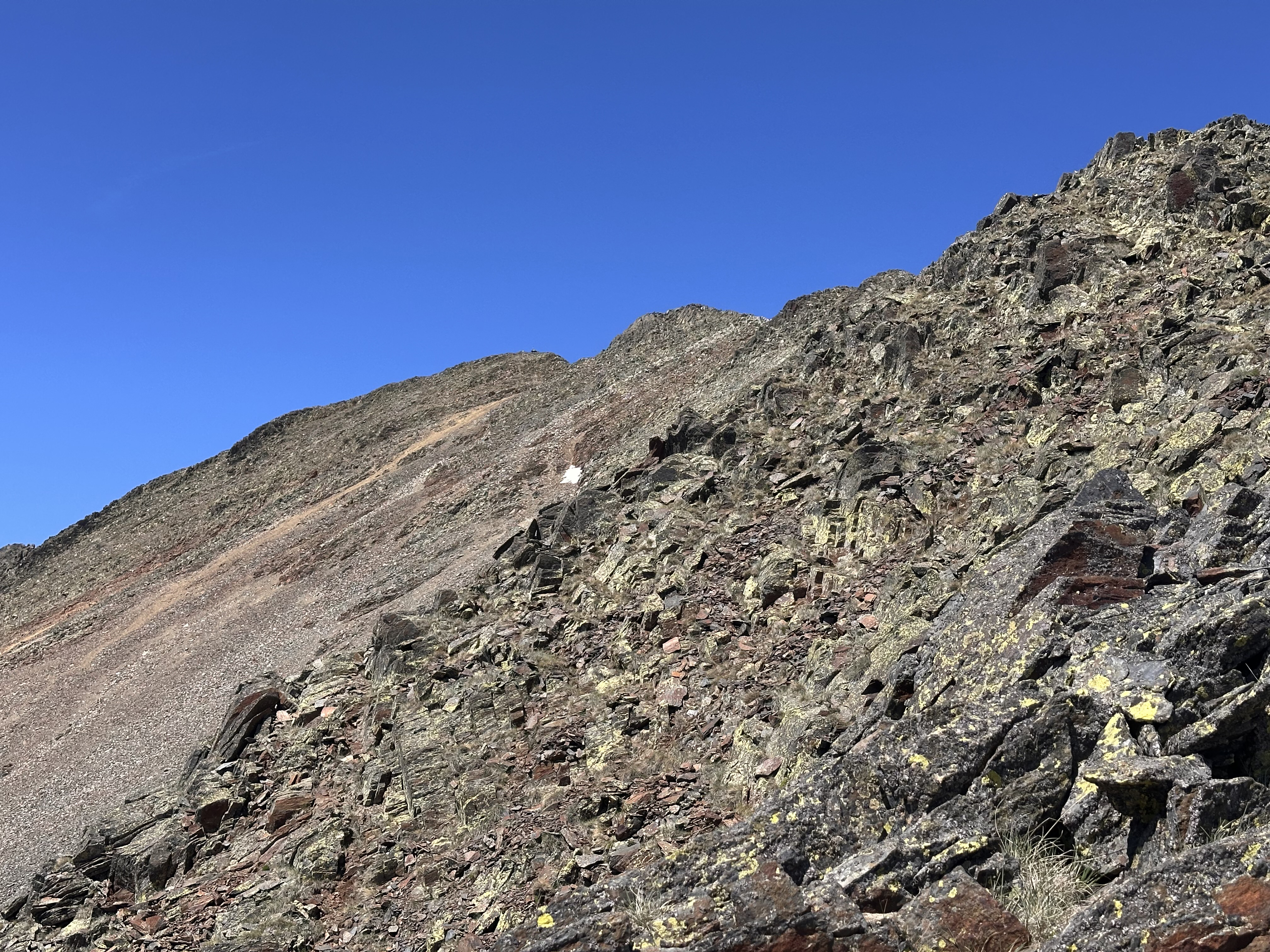 In the hut, the couple had mentioned a point where the trail branched off. I didn’t really know what they meant at the time, as it wasn’t clear from the map. Apparently, in the winter, there’s an alternative route to the main ridge (the ridge is the one AllTrails follows), which crosses a snowfield before ascending a much steeper scree section to the summit. It avoids a bit of exposure on the ridge and that climb, and if done as a loop with the ridge, allows for some varied scenery.