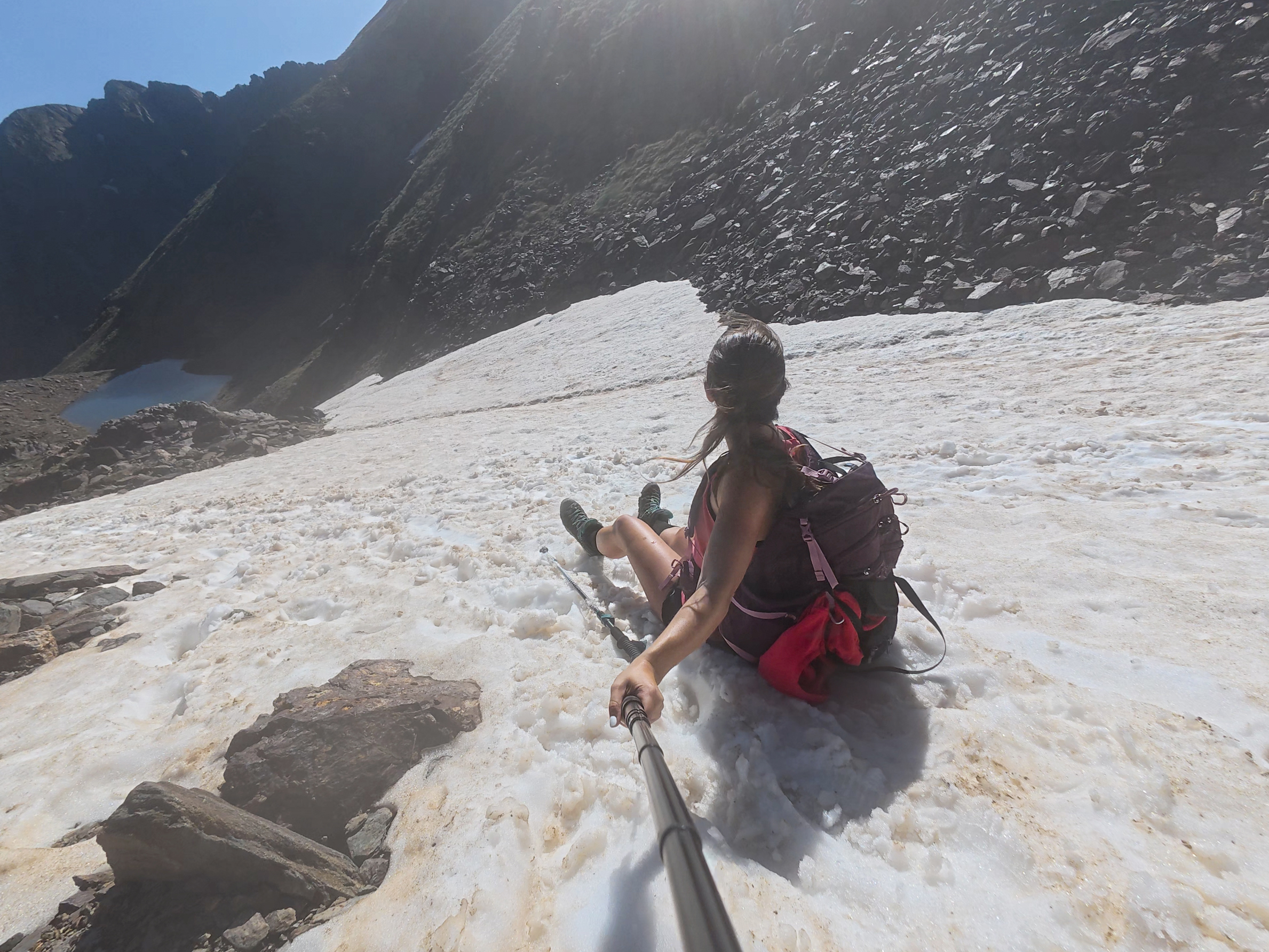 I didn’t want to head back down yet, but it was already after 5:30pm, which meant under 2 hours to complete the descent. I started the race against the setting sun and my growing appetite. Maybe I had a bit too much fun racing down the now-very-soft snowfield, because…I ate it. Landed as shown in the photo, then just sat there. It was still so hot out. Tank top + shorts + snow = normal body temperature finally restored. The layers stuffed in my bag never made it out…weighted pack training, I guess. The views weren’t bad from there!