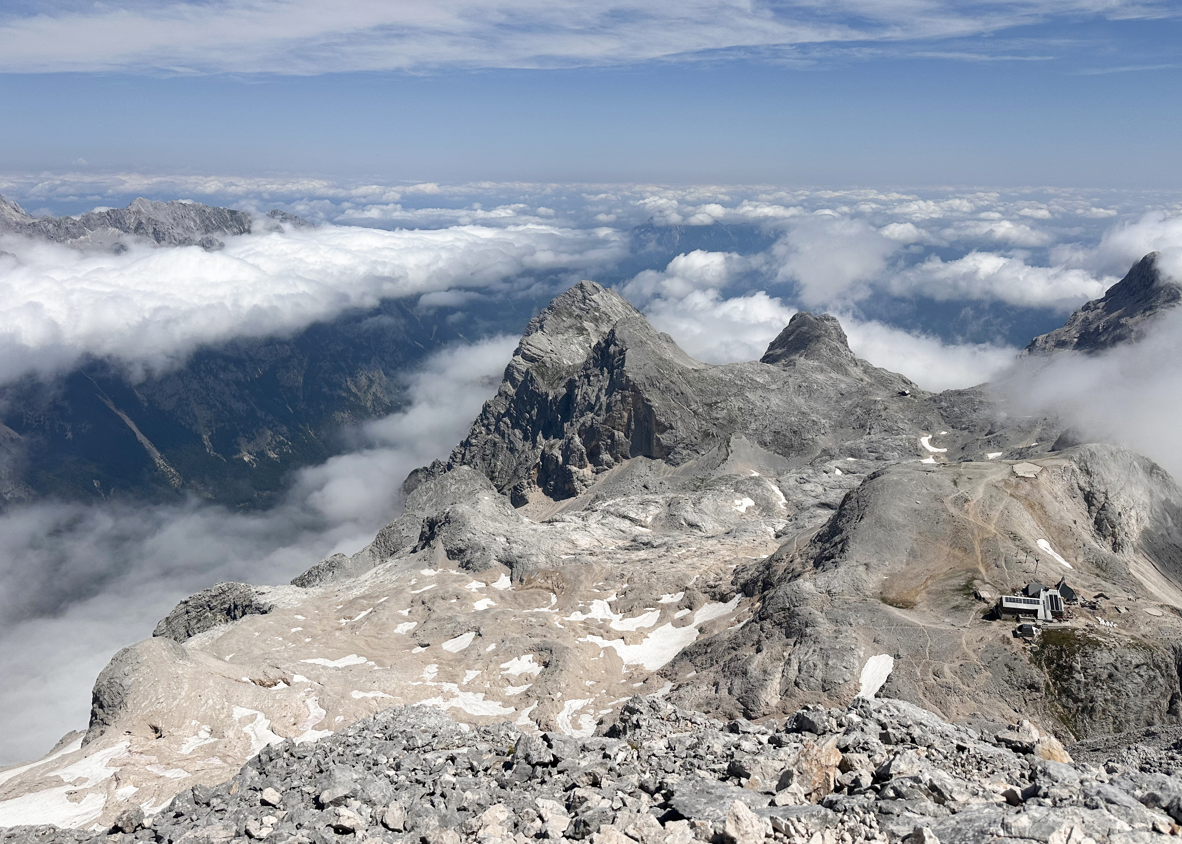 With those queues, the descent to the hut took almost as long as the ascent. I happily plunked down from the final climbing section onto flatter gravel. I’d apparently expended all of my focus on not falling off the mountain, so within seconds, my feet were in the air and butt was on the ground. There wasn’t even anything to trip on. I popped back up, walked a bit further, then saw everyone looking back toward where I’d fallen. Had someone else done the same? Nope, there was a pair of goats – a mom and her baby!! This is in the Instagram highlights.