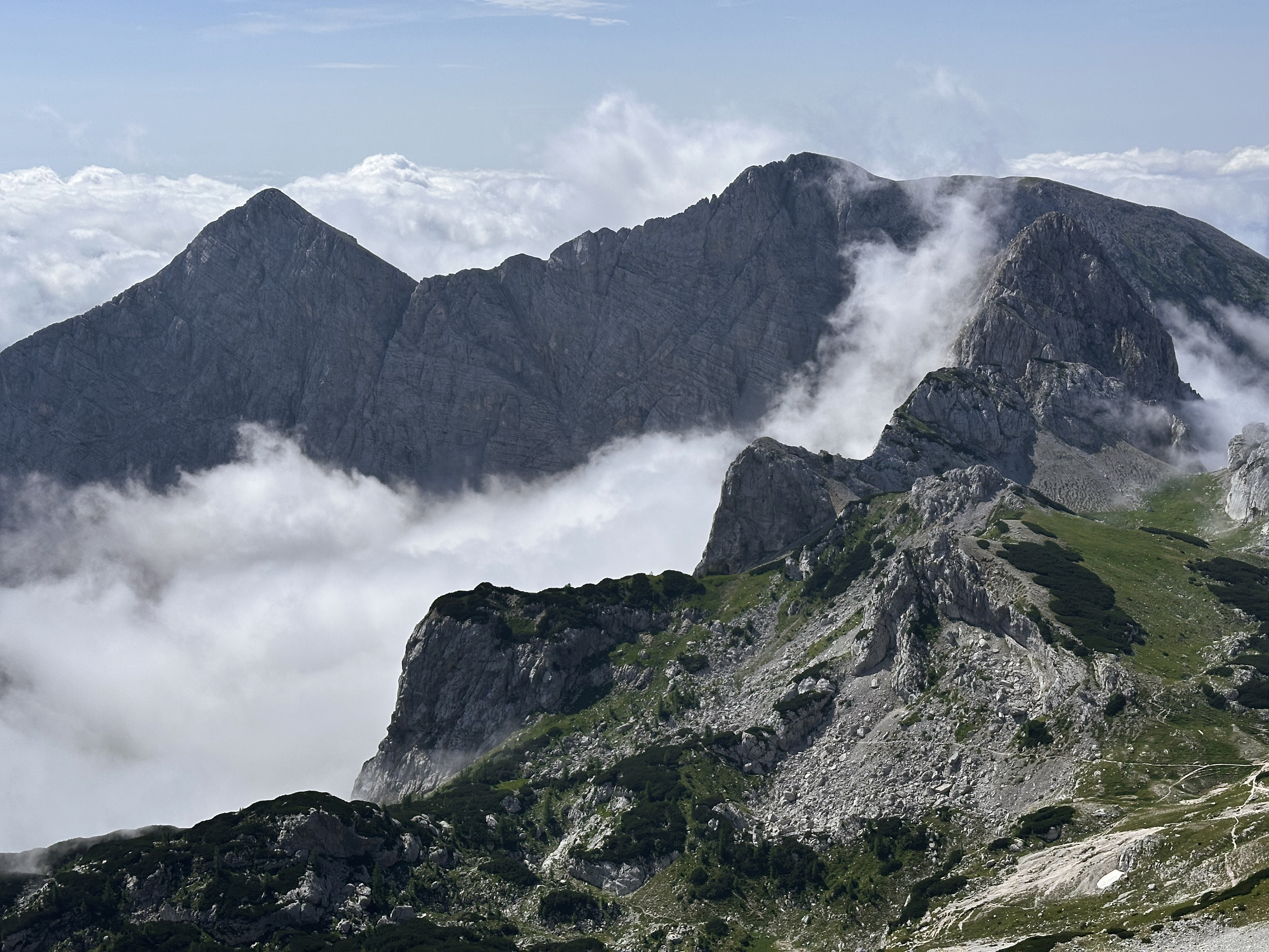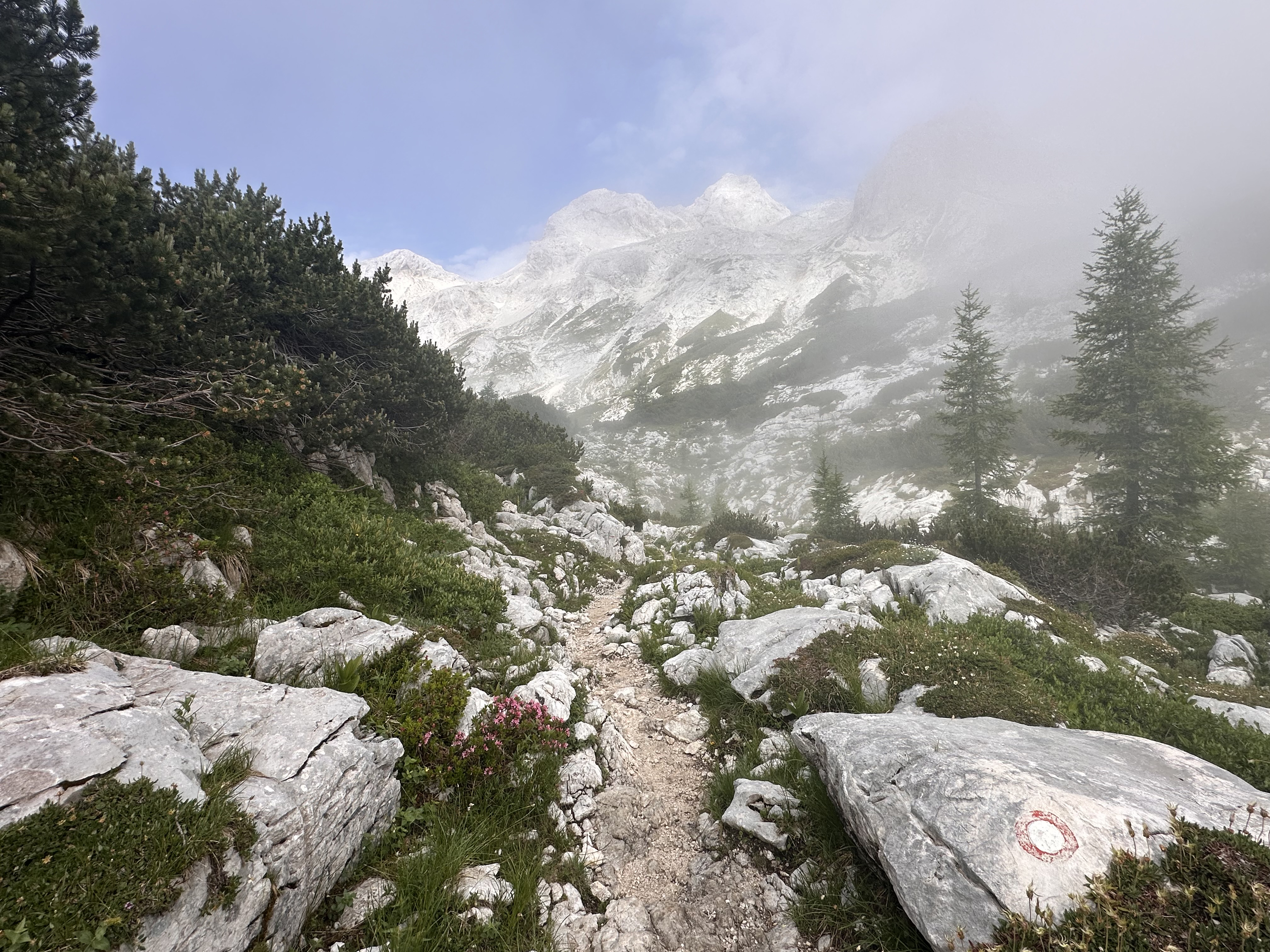 I went into this hike unsure of whether the summit would happen. The phrase “off the summit by noon” would be essential, and it seemed like a same-day summit would be the only option. The forecast had a 90-100% chance of precipitation from 3pm that day (60% chance from 2pm) for 24 hours straight. My plan was to reach the hut by 10:30am and assess from there. With the parking confusion, I didn’t get started until 6:15am. Even at that hour, it was so hot and humid! I didn’t take many photos or videos on the way up…I had to keep a quick pace, and there wasn’t much to see anyway. I was in a cloud, feeling increasingly pessimistic about a summit. The weather was meant to worsen throughout the day, not improve. However, Maglić in BiH gave me a bit of hope. Sure enough, with under 300 meters of ascent remaining to the hut, the clouds began to thin out.