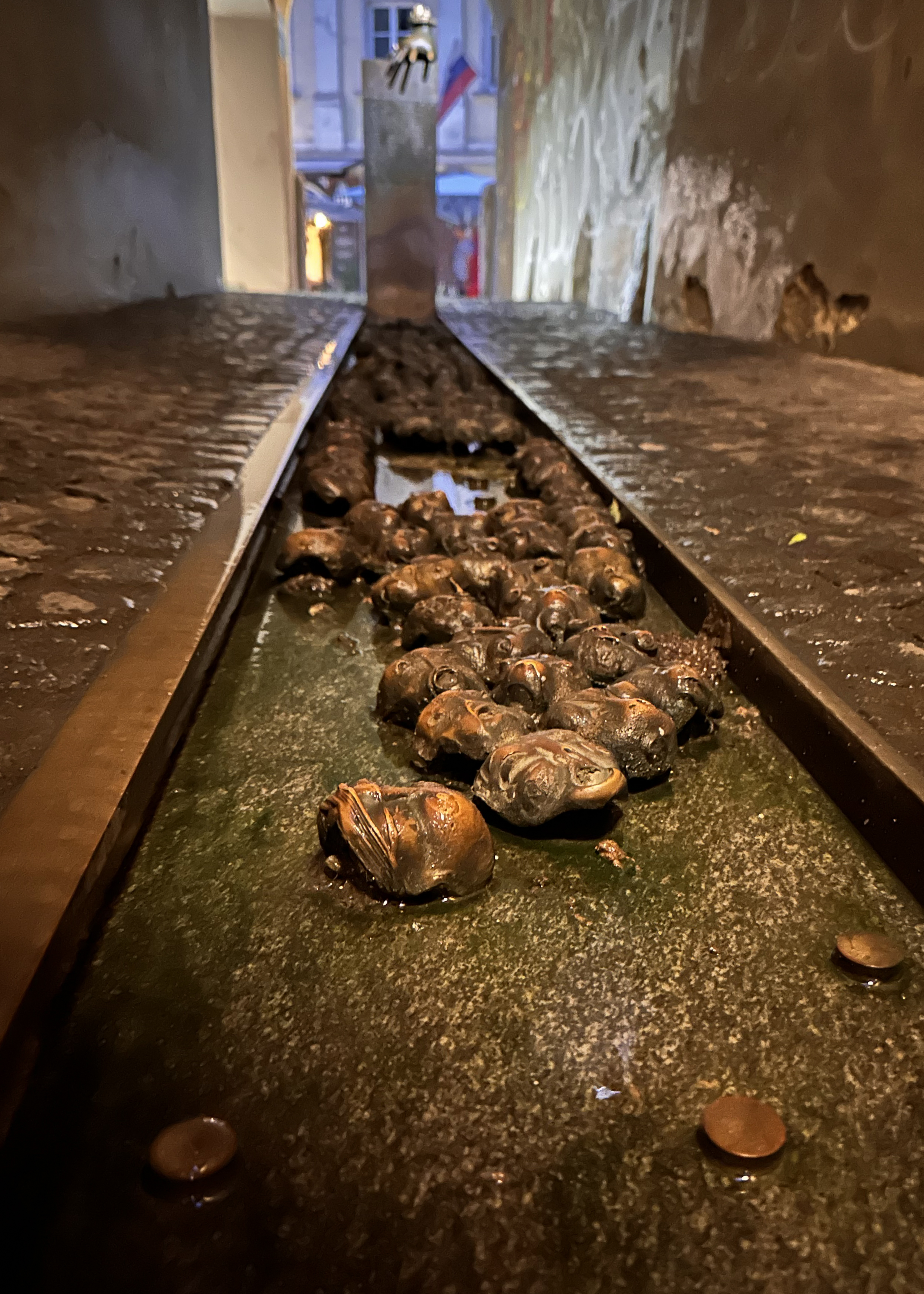 On the way, we passed through a very unique alley called Ključavničarska ulica (Locksmith Street), to see a sculpture called “Faces of Locksmith Street”. Jakov Brdar sculpted this and other works around Ljubljana, and while he normally sticks to Greek mythology, this was an interpretation of a poem by Rainer Maria Rilke. “To think, for instance, that I have never been aware before how many faces there are. There are quantities of human beings, but there are many more faces, for each person has several,” wrote Rilke. There are 700 bronze faces, with a variety of emotions across them, filling a gully right through the middle of the street.