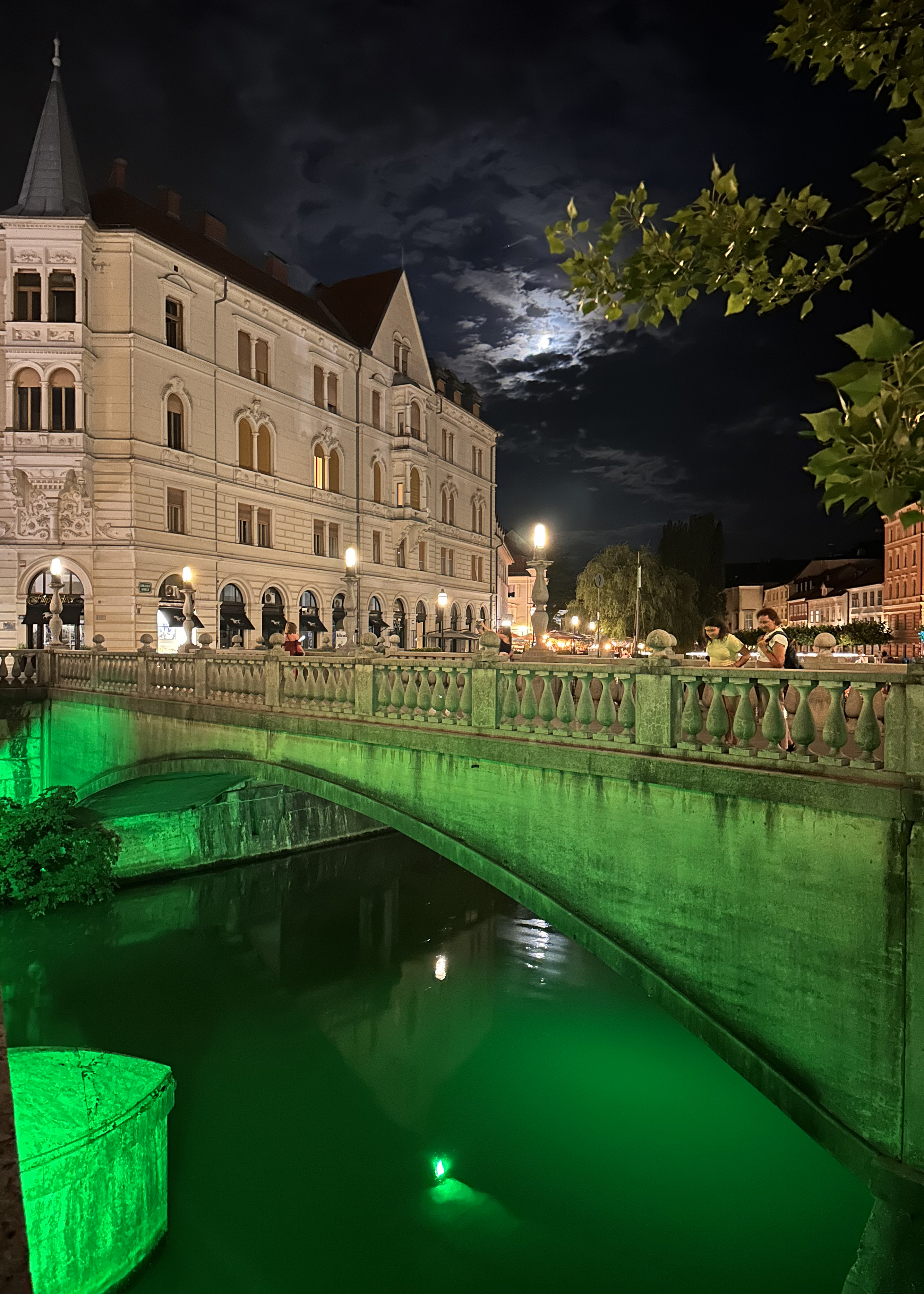 From there, we headed to Ljubljana’s “skyscraper”, Nebotičnik. It has a rooftop bar with views over the illuminated castle. It closes pretty early, at 10pm, so we headed to a gelato spot next.