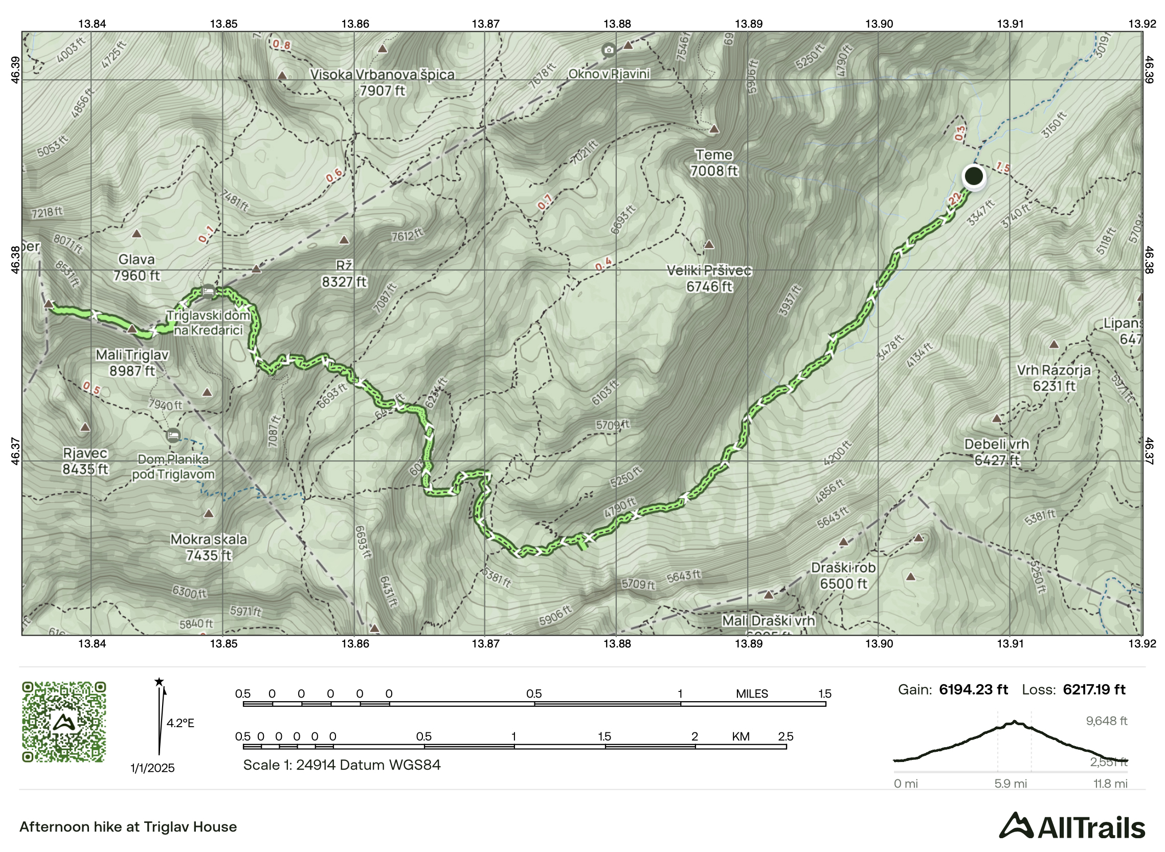 It’s a bit over 1,500 meters of ascent and 7.5 kilometers to the hut (Triglavski dom na Kredarici, or Triglav Lodge on Kredarica). From there, it’s another 350 meters to the summit, for a total of over 1,900m of ascent. The route is pretty much straight up, so there’s <50m of gain on the way back down. All-in, it’s about 2,000 meters!