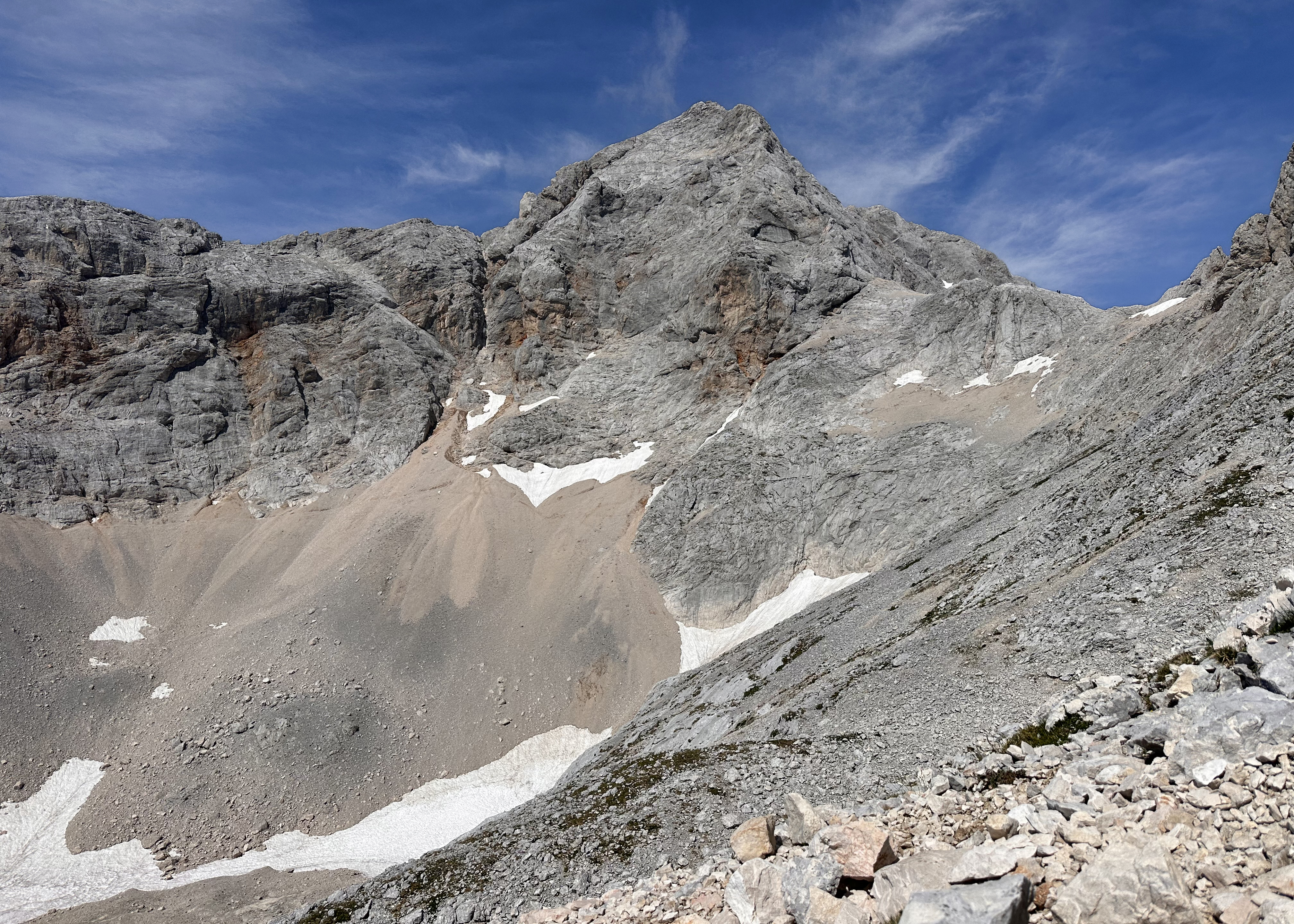 For most of the way down, there was some aerial entertainment in the form of a helicopter doing (presumably) practice drills. Many take-offs, landings, high-tailing it from above Kredarica to the mountains opposite it, and whatever else it was they were doing (Alex was more familiar with that, as a helicopter pilot). The sky did start to look increasingly unstable, but still clear enough for views that were completely absent on the way up. It was like a brand new route down!