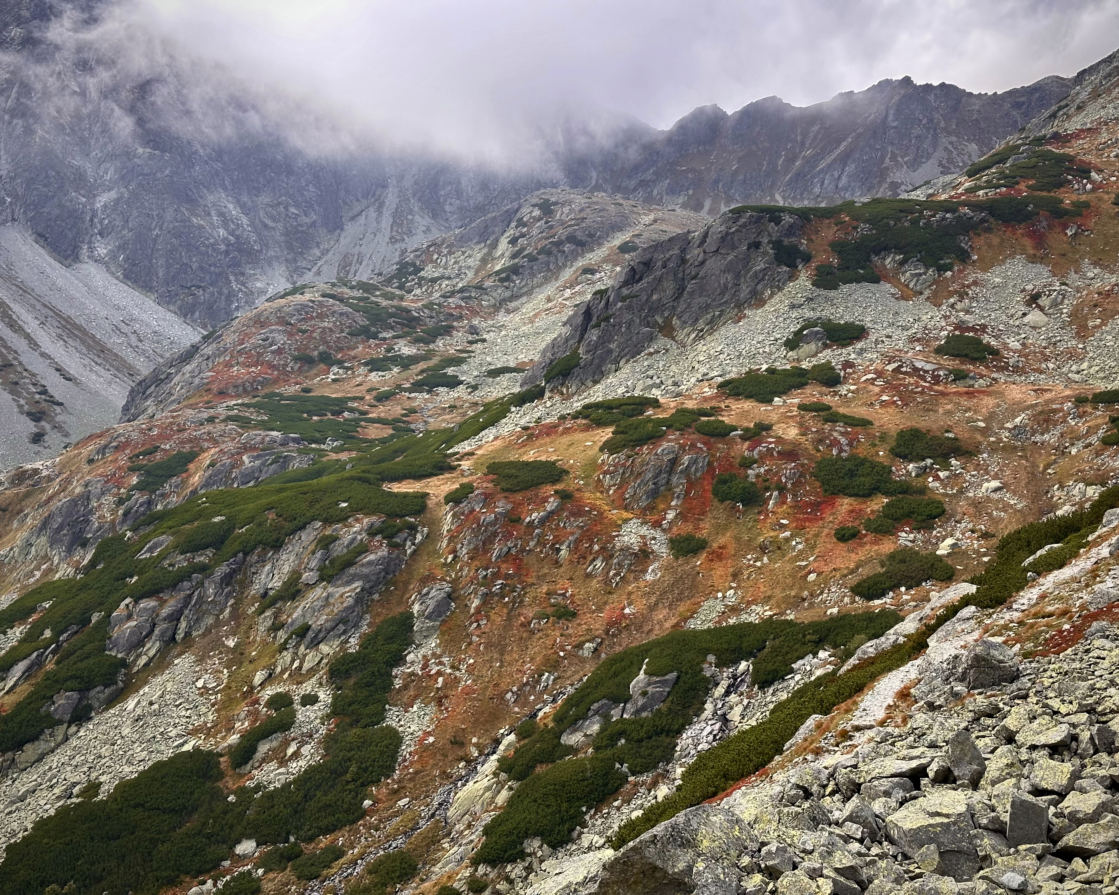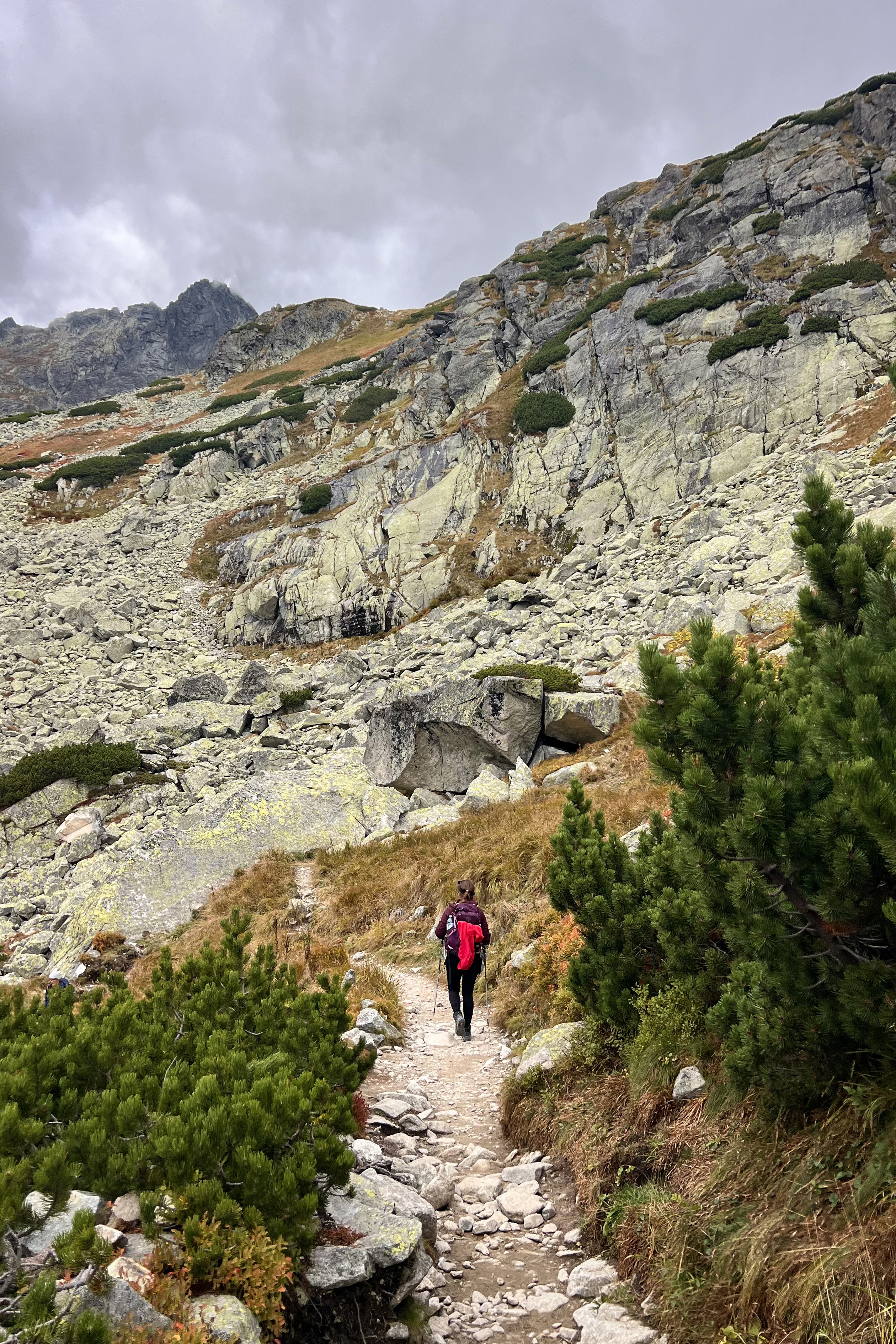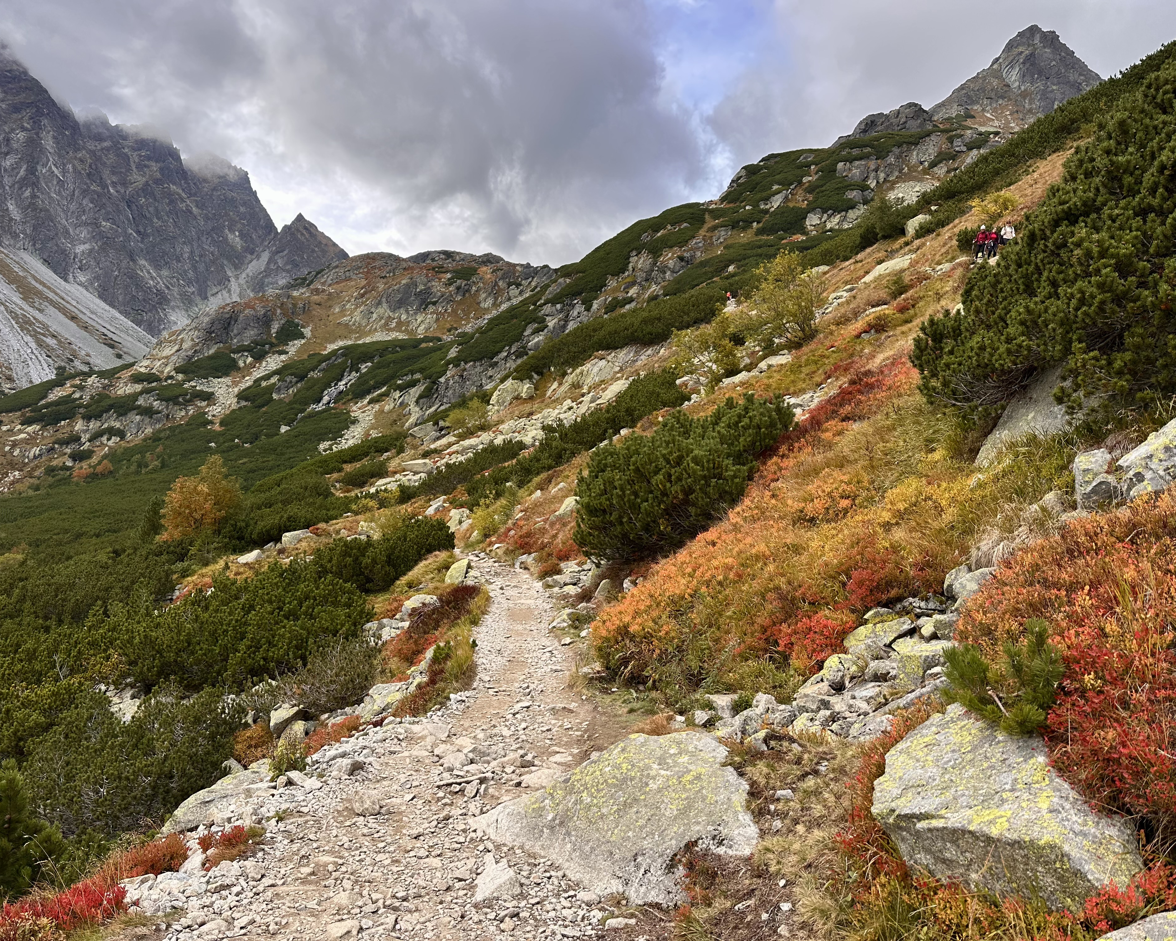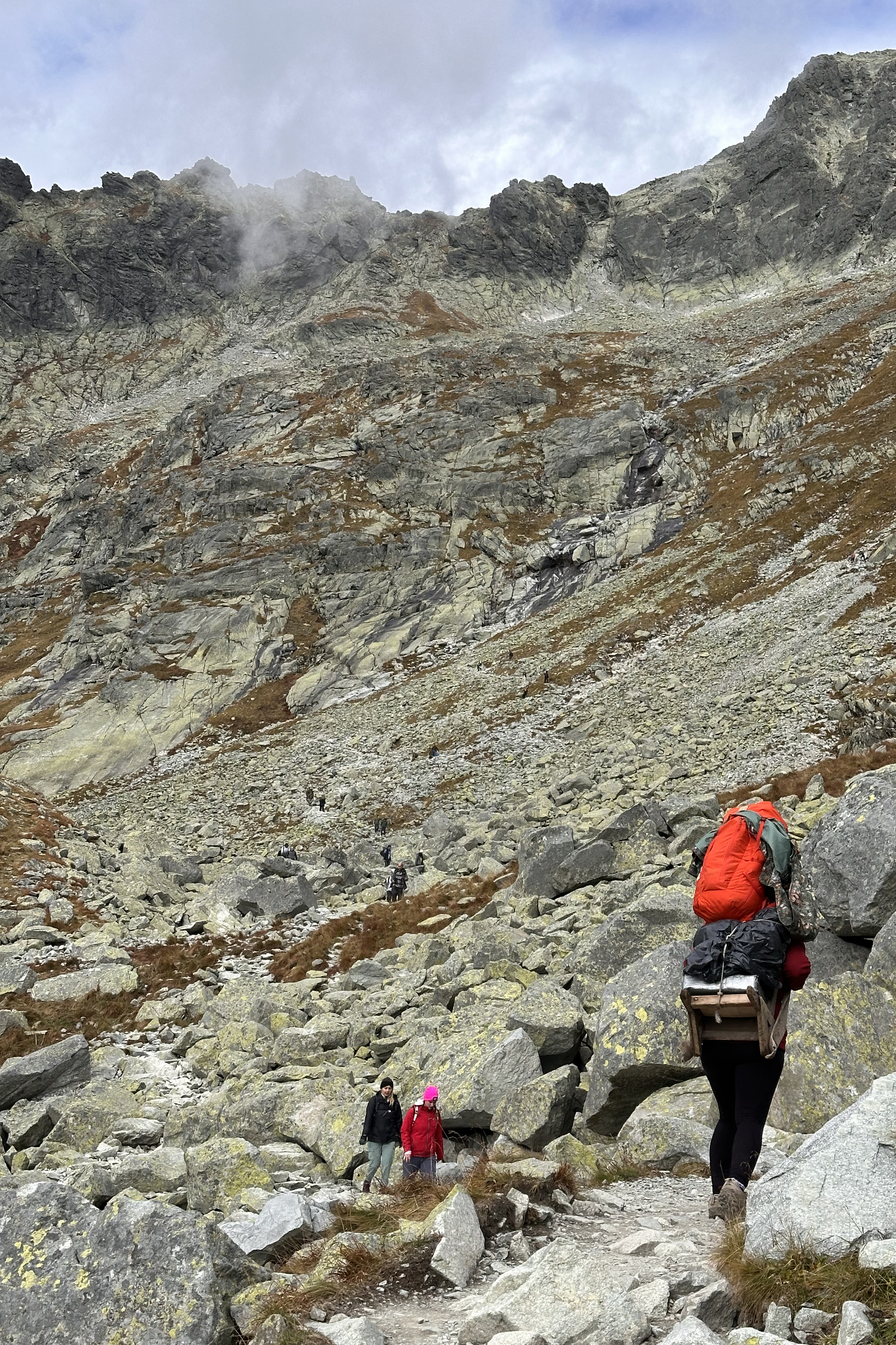 The Slovak side was full of vibrant autumn colors. As Felipe mentioned in the YouTube video, there are many rock benches along the way called stands, built for nosiči to rest from the added weight of their packs. I was using these to rest the toes, as it was the first hike since the post-Gjeravica evacuation 7 weeks earlier!