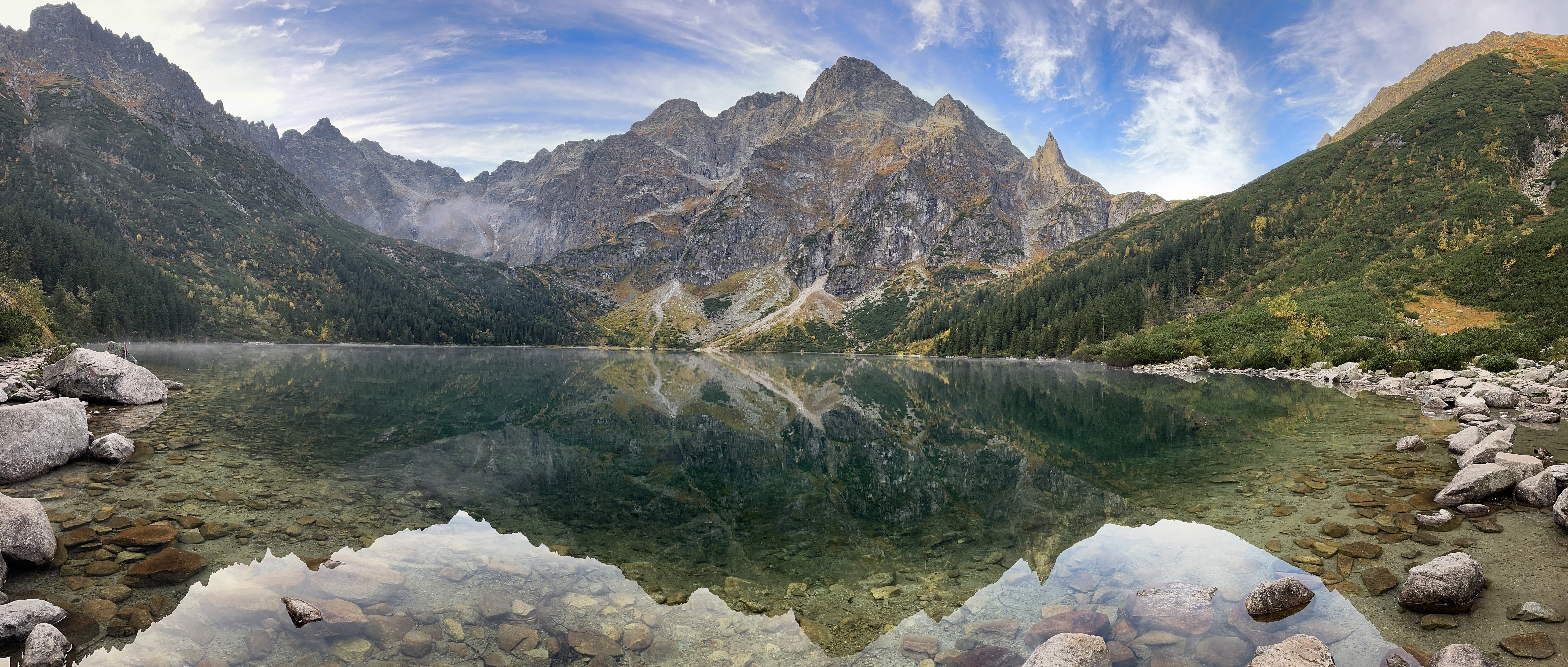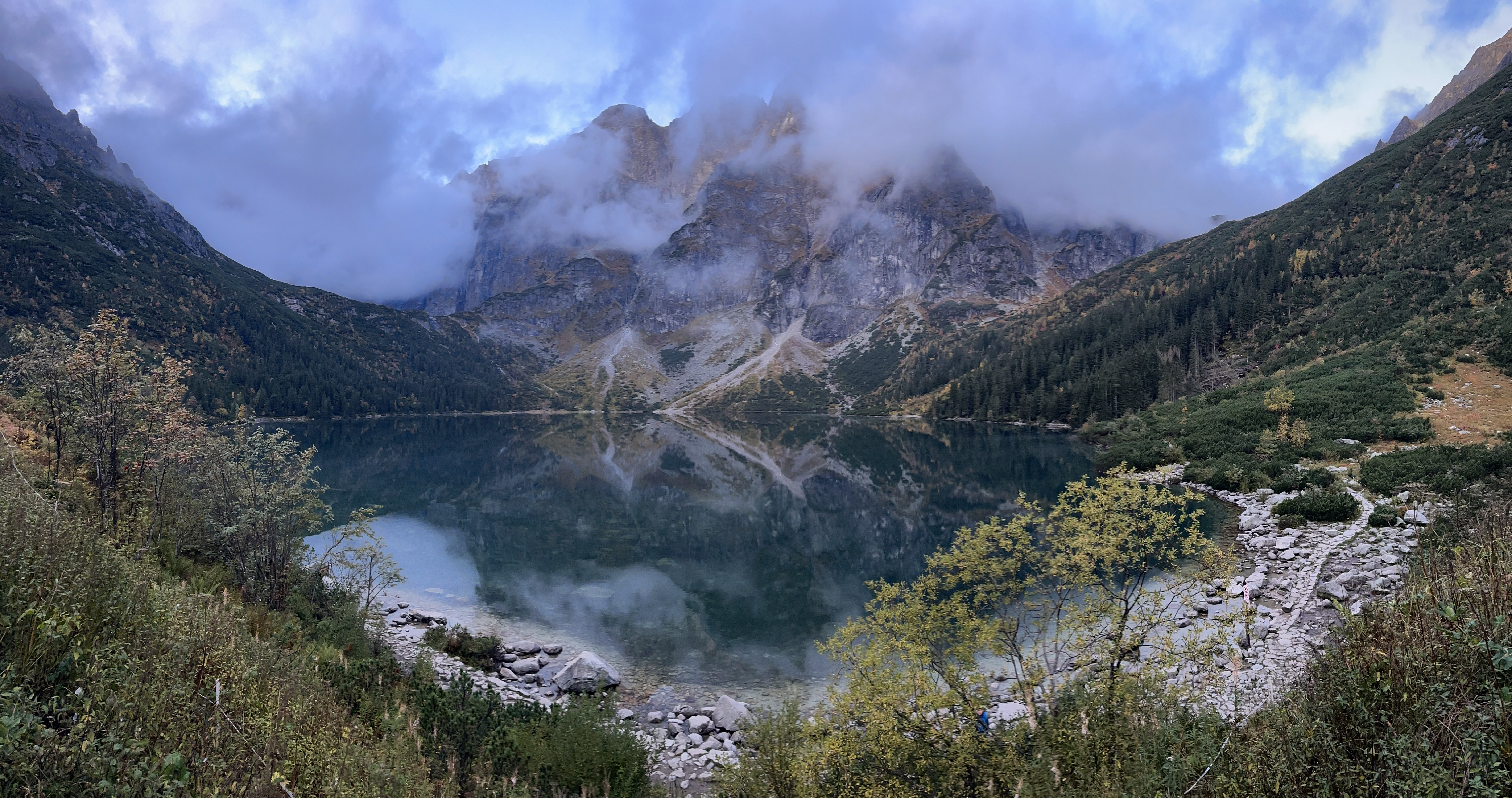 After an hour, the sun started coming up. It was a misty morning, with early autumn colors peeping out. We reached the Morskie Oko hut at by 6:30am, where a handful of other hikers were seated at tables outside. The lake was stunning, especially without crowds! We hung around until the hut opened for breakfast at 7, taking in the views as fog rolled in and out.