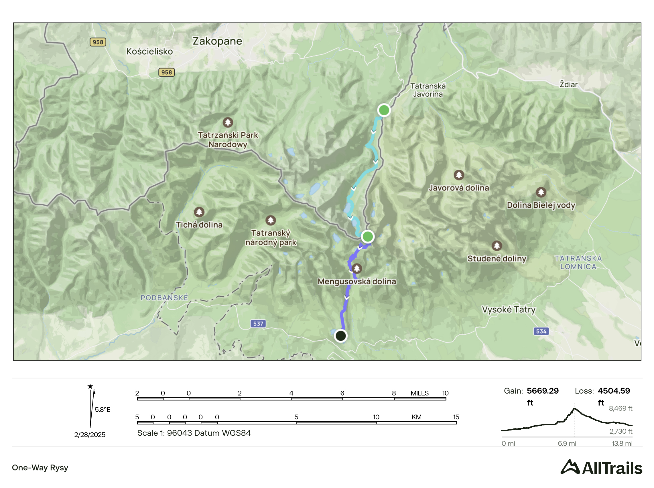 The one-way route we followed from Poland to Slovakia was over 22 kilometers, 1,730 meters of ascent, and 1,375 meters of descent. My recording got pretty messed up, so below is the custom route I’d made in AllTrails.